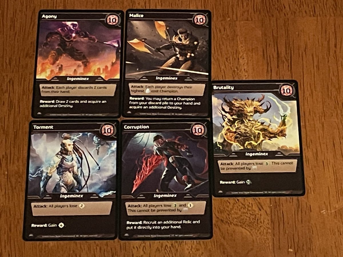The other cards feature allies and champions for the factions, but there’s one other new card type, the Ingeminex. These cards go into the center deck and can pop up any time the center row is being replenished. Instead of going to the center row, they get placed in a separate area and another card is drawn for the center row. The Ingeminex are powerful cards that affect everyone equally. They can cause losing health or mastery, discarding cards from your hand, or putting your highest cost champion into your discard pile. Since these take effect every turn, you could end up with much less health or cards in your hand before you can try to defeat the Ingeminex. You might not want to because it is causing your enemies harm that you can get through. However, the reward for defeating an Ingeminex can include a second destiny card which can be game changing, so you’ll probably want to take care of the Ingeminex sooner rather than later.