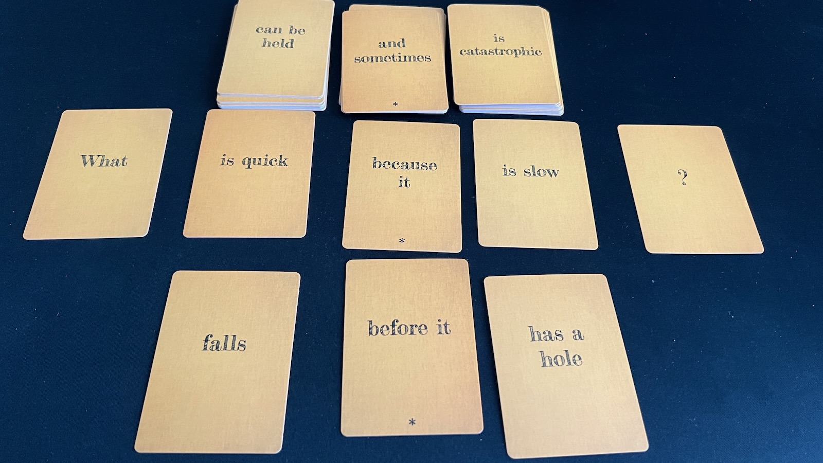 - Riddle Cards: a deck of 89 cards featuring adjectives and verbs