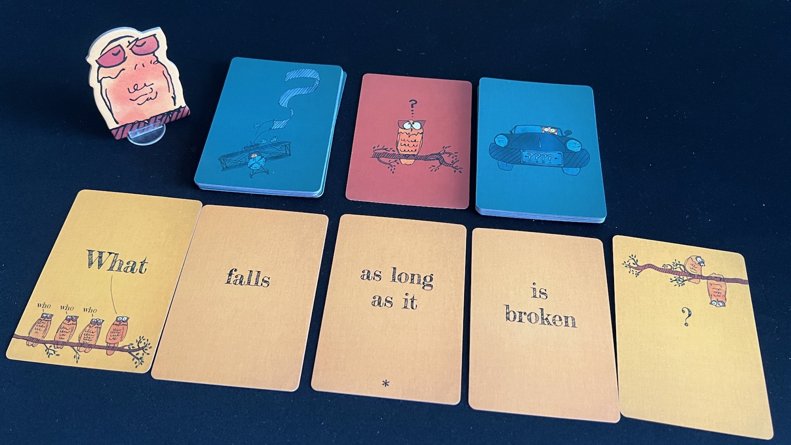 Each round, players will flip a card from each of the three decks creating a riddle using the format of “What – riddle card – conjunction card – riddle card – ?.” The new riddle is read out and players will try to come up with their best answer. When they have an answer, a player will slap their hands on the table. The last player to have their hand off the table becomes the Smug Owl for the round and will judge the answers. Starting with the first player to slap their hand, players will go around the table in clockwise order revealing their answers. The Smug Owl will then distribute the two riddle cards and the one conjunction card to their favorite answers in any combination. For example, all three cards can go to one player or three players can each get one. After this step, the round ends. At the end of 8 rounds, the player with the most cards will be declared the winner of the game.