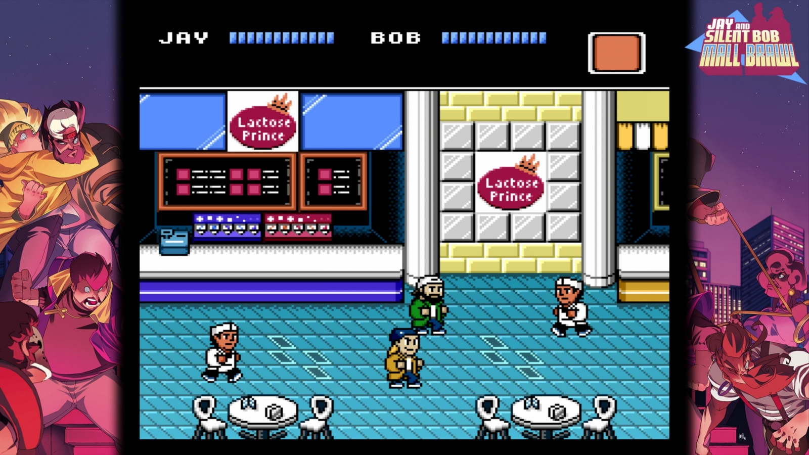Taking place directly after Jay and Silent Bob’s Dating Show sabotage which occurred in Mall Rats, Mall Brawl follows our stoned out heroes as they fight off mall security, disgruntled employees, reckless women with baby strollers, and even a poop monster.Yes, you read that right – a poop monster. The duo’s typical potty humor is alive and well in Mall Brawl. While enemies are basically cut and pasted with different color outfits or costumes, boss fights are where Mall Brawl shows its creativity.