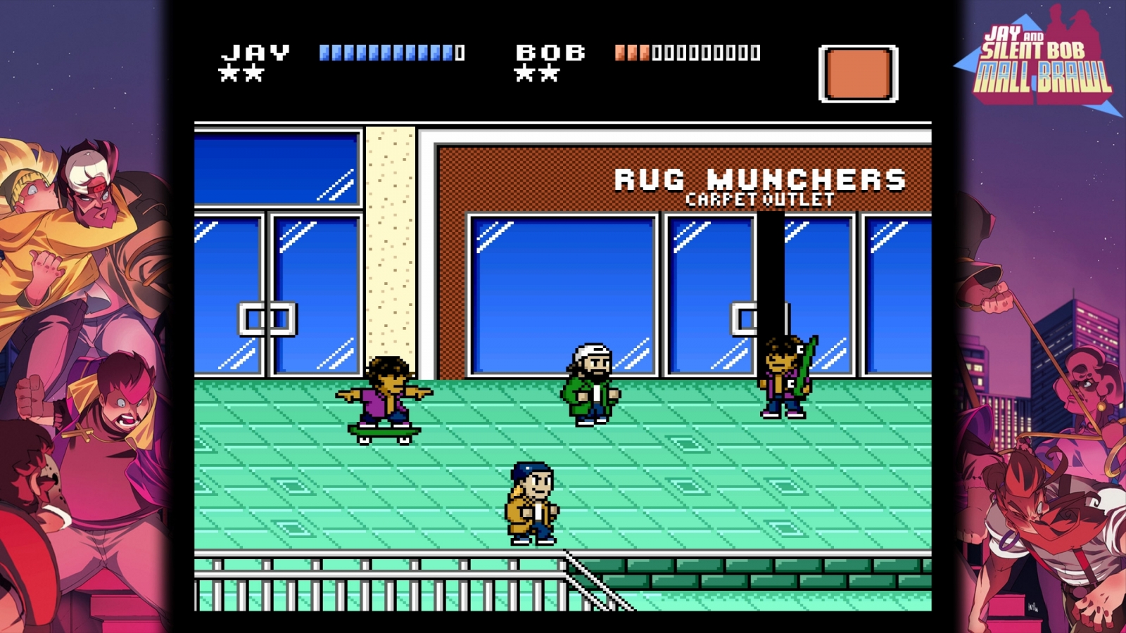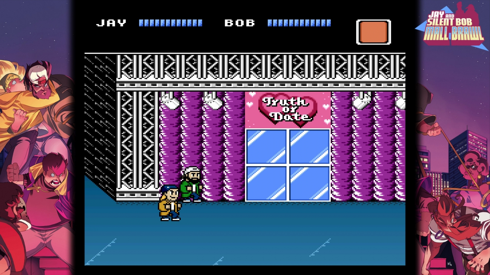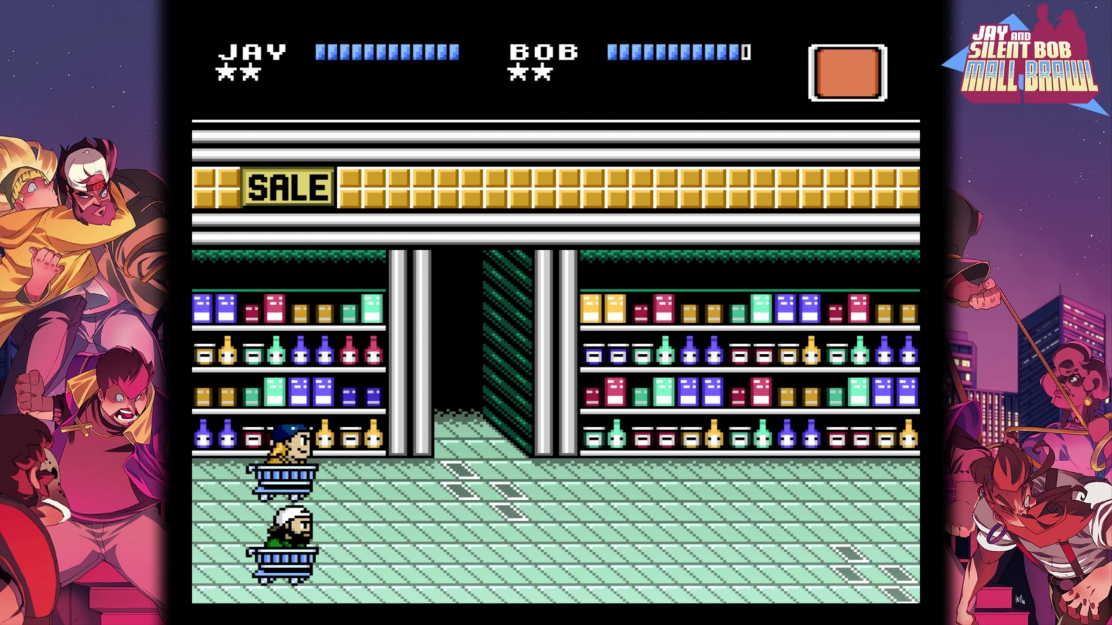 In Mall Brawl you are only technically given one life, but you do have control of both Jay and Silent Bob, each with their own health meters. While playing solo you can switch between the two at will. The character not being used will slowly regenerate their health while you are actively playing – but be warned you cannot stand still and expect health to regenerate. You must be actively moving forward or fighting. This system forces players to stay active and switch between characters often and is arguably the best way to play Mall Brawl.