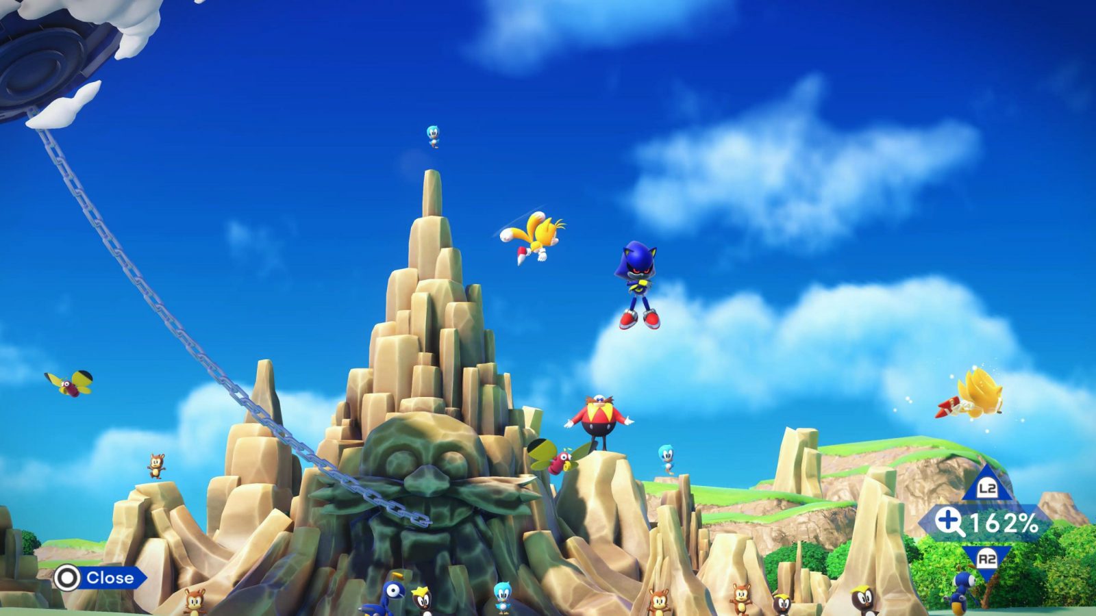 In the main menu, you have several headers and underlying modes to choose from, each accompanied by a cute diorama style island. By moving left or right, or choosing from an overhead map, you can choose from Sonic 1, Sonic 2, Sonic CD, Sonic 3 & Knuckles, a Museum, and Mission Mode. In each of the games, you can play Anniversary Mode, which has updated features like 16:9 aspect ratio, unlimited lives, and the drop dash from Sonic Mania, Classic Mode, the original game with 4:3 aspect ratio, Boss Rush, where you fight each boss in a row for Coins, and Sonic 3 also has a mode for the Blue Spheres challenges including completely new stages. Beating a game will unlock Mirror Mode, in which the game is mirrored left to right.