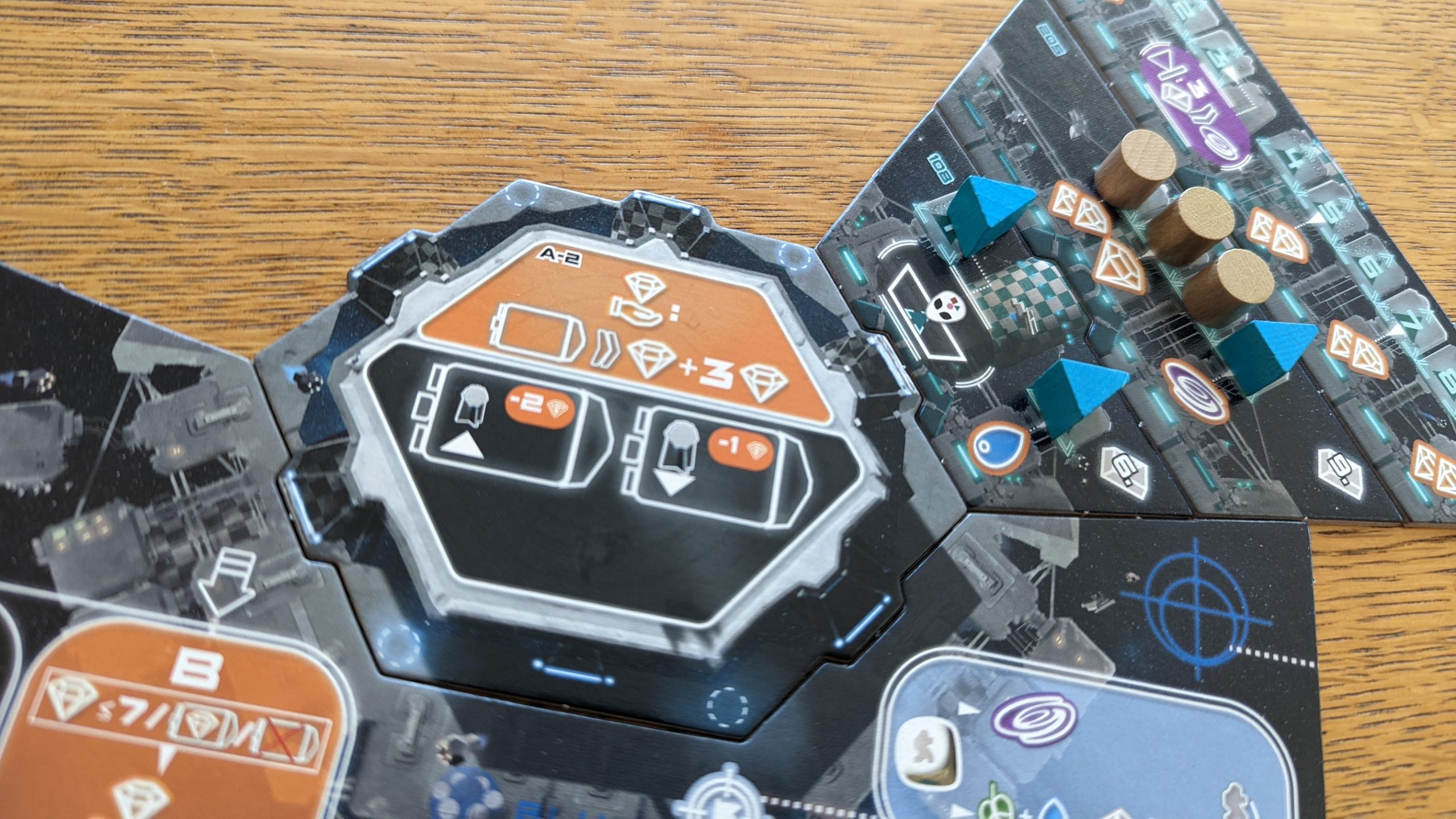As players construct their stations, they will build separate wings for each of the three aerobic aliens( pink, blue, and brown), each with sectors in ascending size. Each sector has a varying resident capacity , and sometimes feature powerful bonuses, usually on sectors with lower capacities. Since each alien resident is worth two points in in-game scoring, every build is an interesting decision, weighing in-game power against end-game points.