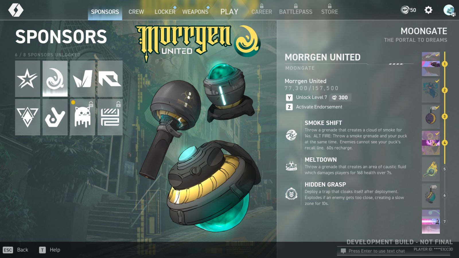 Still, there are good abilities, like Morrgen United’s smokeshift, a smoke that can be alt-fired to send your spectre along with it. Sponsor Pinnacle International has a stim that heals your main body while your other body gains vision that contrasts enemies against the background better while ignoring weapon move speed penalties. Muu Robotics has a throwable “hyper dome” that creates a fast recall zone with a light shield. It’s this kind of balanced, wholesome synergy with the spectre system that I wish more abilities had. I also have to praise the sponsor’s art direction, as each one vibrantly pops with its own aesthetic.