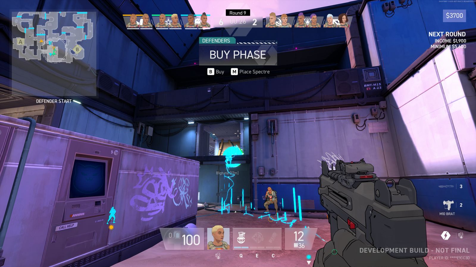 Two teams of three face off in the staple game mode, which is the typical attack and defend the bomb sites style with 14 rounds and a side switch halfway through. Although, each person has two bodies, so it’s more like 3(+3) VS 3(+3). The system is called “Duality,” and the way it works is simple; every player has a “puck” they can throw to move their spectre remotely, but the transfer isn’t instantaneous. A tether of electricity immediately links the spectre and the puck, and the spectre will rapidly move to the other end, all of which is visible to enemies. The further the puck is from the spectre, the longer the process will take. There are also small zones highlighted in blue called “fast recall zones” that speed up the transfer if your puck lands in their borders, but enemies will probably keep their eyes on those spots. The act of switching between the two bodies is almost instant, and your inactive spectre will stay crouched where you left it and alert you if enemies are running or shooting nearby.