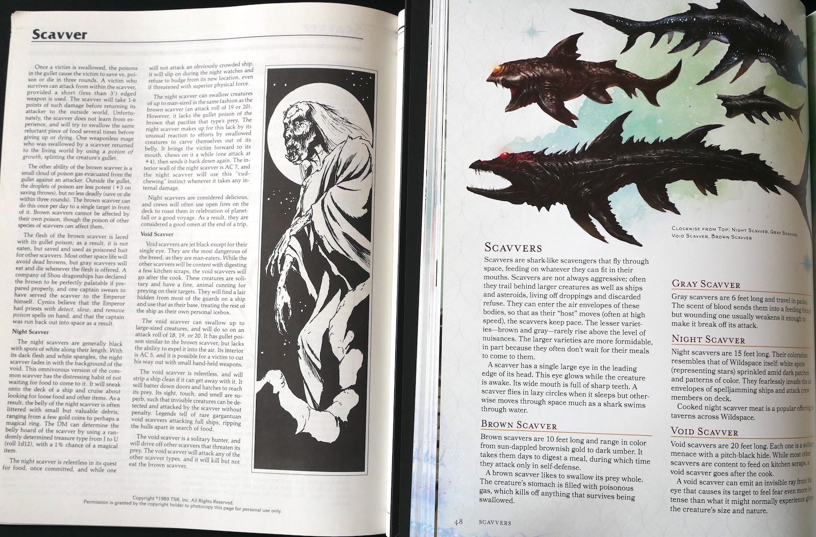 STEVEN: Many of the Spelljammer concepts stay the same between editions, but two changes (other than the disappearance of crystal spheres and the phlogiston) stand out. First the disappearance of all the different varieties of Spelljamming Helms – dropping it down to just one. I like this change, it removes a lot of bookkeeping and keeps the focus on flying ships and not what makes them fly. The second change is the addition of nautical flare to Wildspace and the Astral Sea. In the old set, flying through Wildspace was akin to flying through actual space – no life out there. And the phlogiston was the same, but literally explosive. Except for the occasional large creature or other Spelljammers, there just wasn’t anything to see between the planets and spheres to see. But now, the atmosphere is much more like that of the actual sea. While the rules never expressly explain that there are fish and seabirds and the like floating around, the artwork indicates it, the fact that you can now fish off the side of your Spelljamming ship implies it, and the accompanying adventure, Light of Xaryxis includes this flavor text, “Scores of pelicans, mollymawks, and smaller birds nesting on the asteroid squawk as you approach the rickety dock. At the end of the dock, two gray, shark-like creatures fight over the remains of a pelican.”