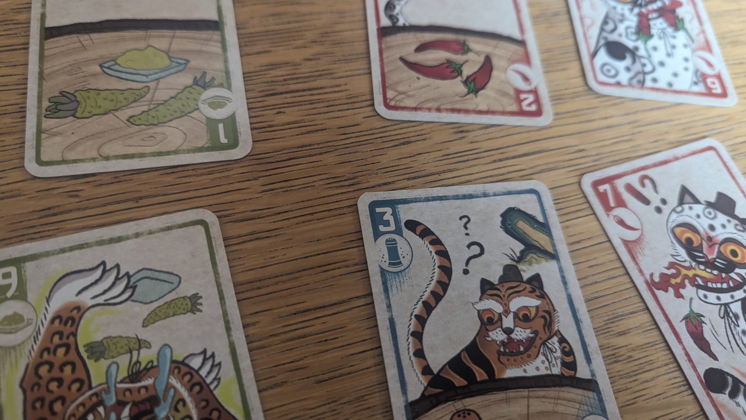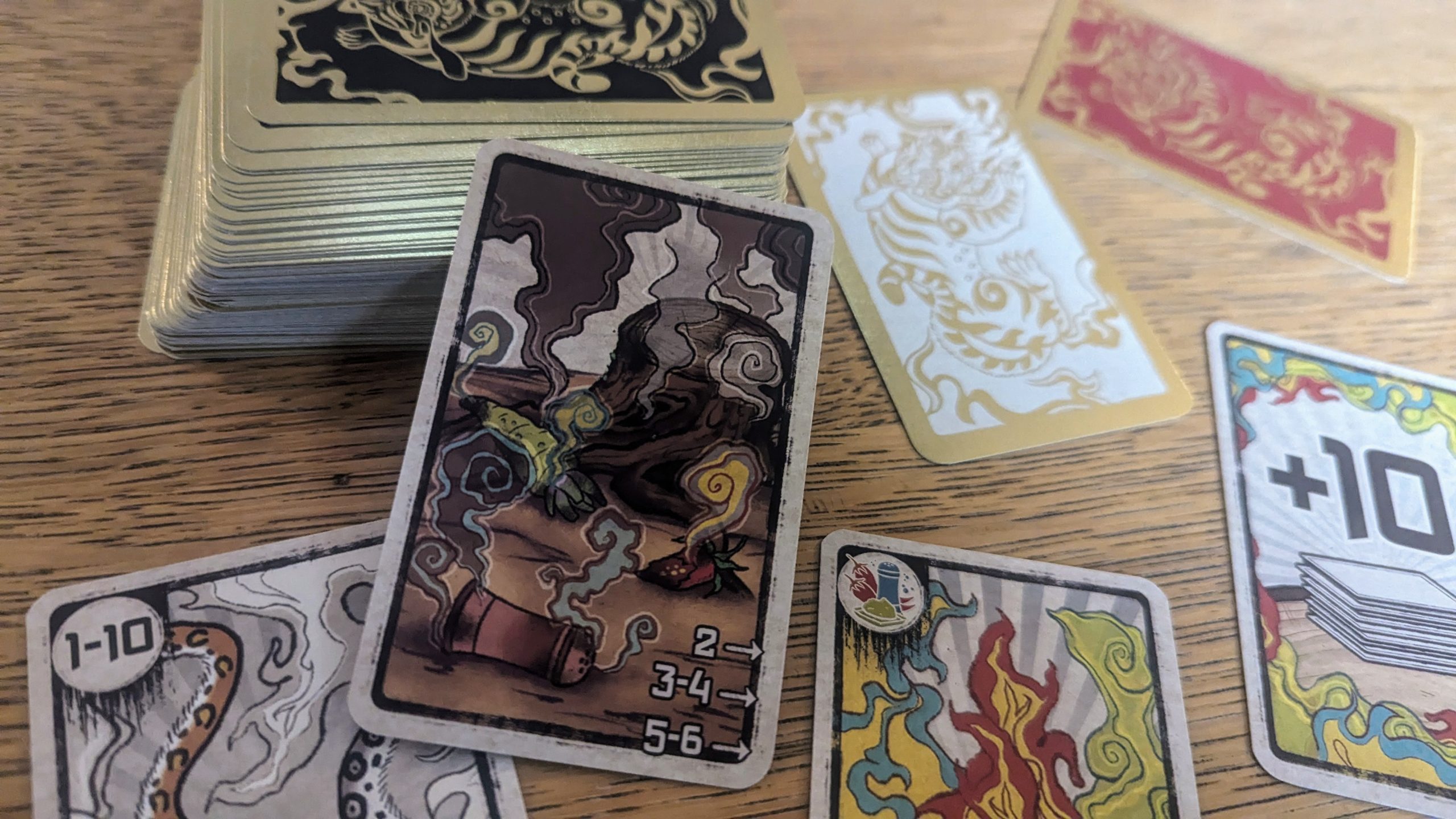Getting the bad thing out of the way first, yeah, this is just bullshit in a too-big box. Your standard deck has been altered-trimmed from 4 suits to 3, with face cards eliminated, an additional 2 copies of each card added to make monopolization more difficult, and finally number and suit wilds added to make calling bullshit always a smidge dangerous. But after I overcame that negative, I saw how brilliant every aspect of Spicy is. The gorgeous card art combined with the foiling on the card back makes the game feel luxurious even though it’s still dirt cheap. The end game trigger card has you stand it up and then put it in the deck around where its player count arrow was, which lets anyone who for whatever reason doesn’t know bullshit know to anticipate something that’s relatively unserious. The rules slightly tweak classic BS, but instead of trying to make it “gamier”, the change here is a lubricant, making the game a smoother experience for everyone. Looping back around to the deck, the changes Fare appreciated after a play: eliminating a suit and just over a quarter of the numbers while adding wilds means you’re that much more likely to be able to play accurately on one of the two, but having to stay within suits while a pile is going makes the choice of what to play and when to call bullshit always interesting. I love the core game here. It’s worth mentioning that the box also comes with variable rules that also have deluxe feeling reminder cards because of course it does. I’m not particularly fond of any of them, but I’m happy they’re in here for anyone that does like them. Now that I’ve got my review copy in my collection, I’ll not just be using it as a filler, but to kick off any day of games that include suspicion, like Battlestar or Game of Thrones, just to break the seal on everyone screaming “bullshit!” at each other.