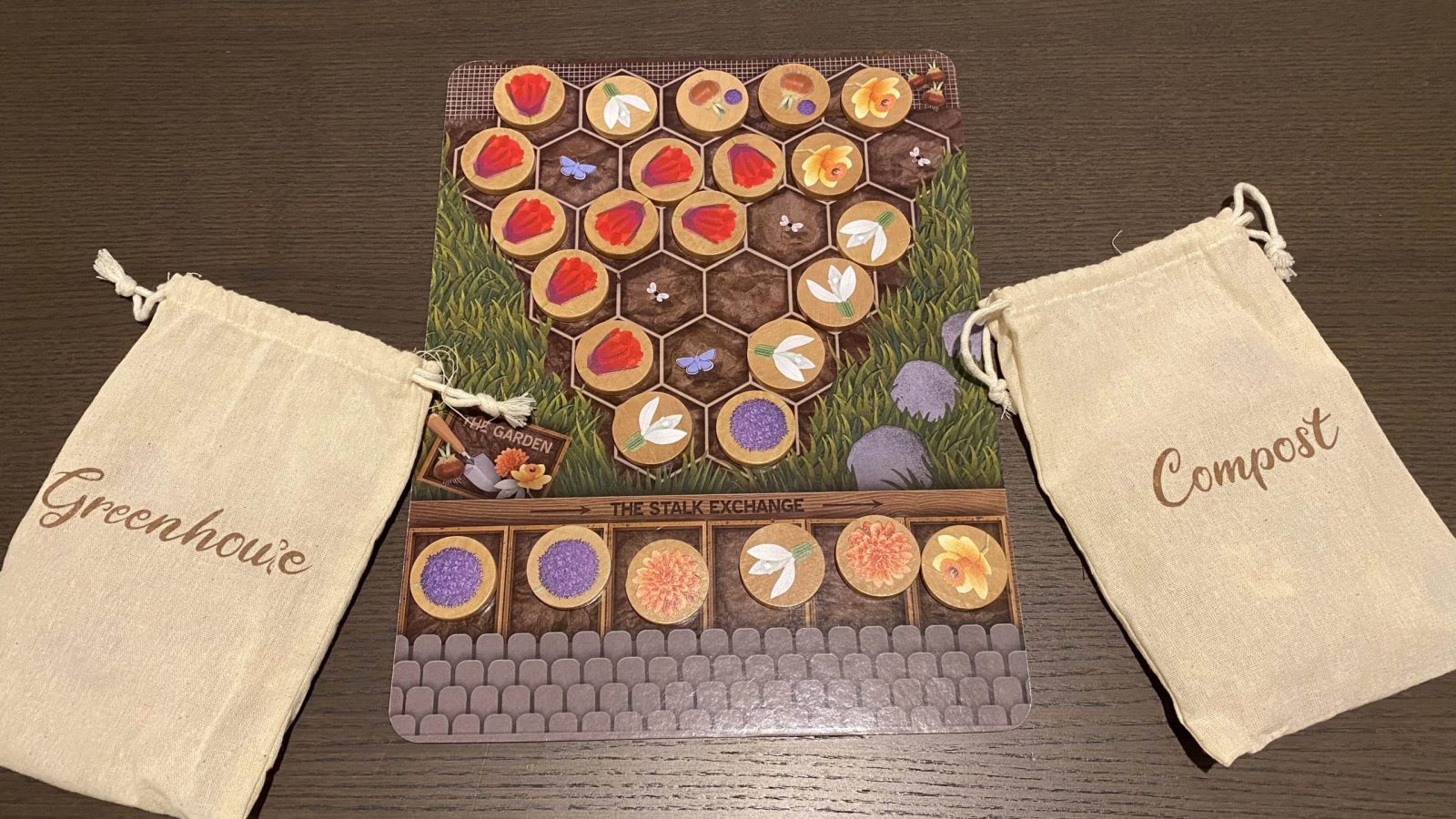 Unfortunately, not every component is as satisfying. The game comes with two bags that the flower tokens sit in when not on the board. The compost bag, which is where they go after being kicked off the market row, and the garden bag, where they’re mixed and dealt out to form said market row. The compost bag is perfectly fine, since it never needs to hold very many tokens. But the garden bag is the same size, which is laughably small when you’re expected to both store and mix every single flower token inside it. It isn’t even a tight fit, there’s simply no possible way every token could fit inside that bag. I would go so far as to recommend that anyone purchasing this game have a properly sized bag available to replace the one included. This is very disappointing to me because it does impact the actual setup; I need to find a different way to shuffle the tokens. I do hope that if there are future printings of this game that they fix this glaring issue.