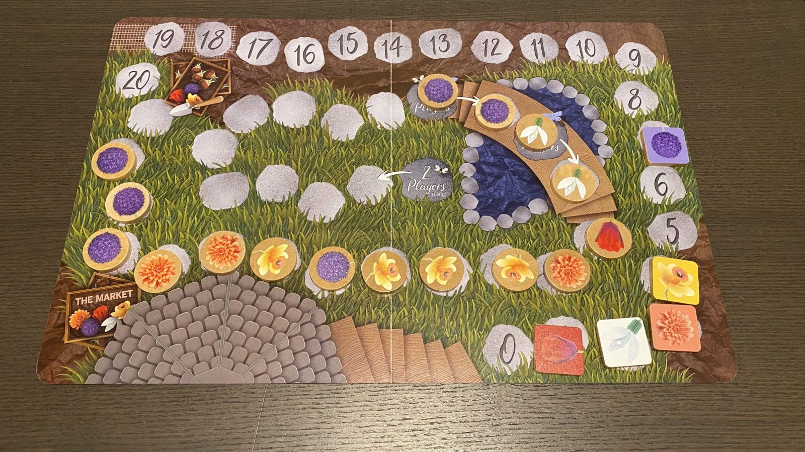 The game is simple; on your turn you take two actions, either planting buds in the garden board or swapping your randomly dealt flowers with those in the market. If you want to spend your “seedy business” tokens you can take extra actions or flush the market, but there’s no way to get them back. After you’re done, any flower groups that are completely surrounded get harvested and add to that flower’s value. Any buds with enough room grow into flowers. The game ends once the harvested flowers and the value tokens cross paths. Before scoring, the highest valued flower crashes and loses half its value. Scoring itself is just multiplying the flowers in your stash by the flower’s final value.