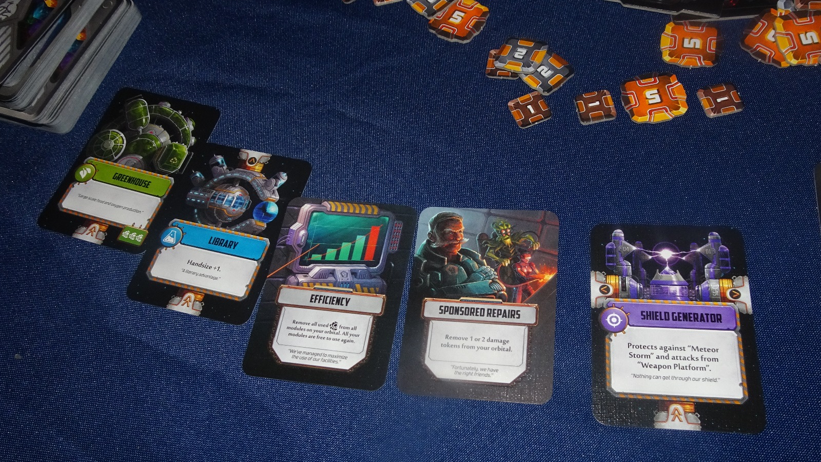 Player actions are fairly limited each turn: either they can build a card out of their hand, use some of their buildings, or play an event. Of course later rounds take a little longer, but early rounds are usually over in a turn or two which keeps the game moving. One of its better parts is at the end of each year there is an ‘award’ section of victory points, this is based on which type of modules a player has constructed and the highest player in each category scores the point. While there is not much direct player interaction beyond some sabotage cards, this reward race is interaction enough to not make the game feel like multiplayer solitaire.