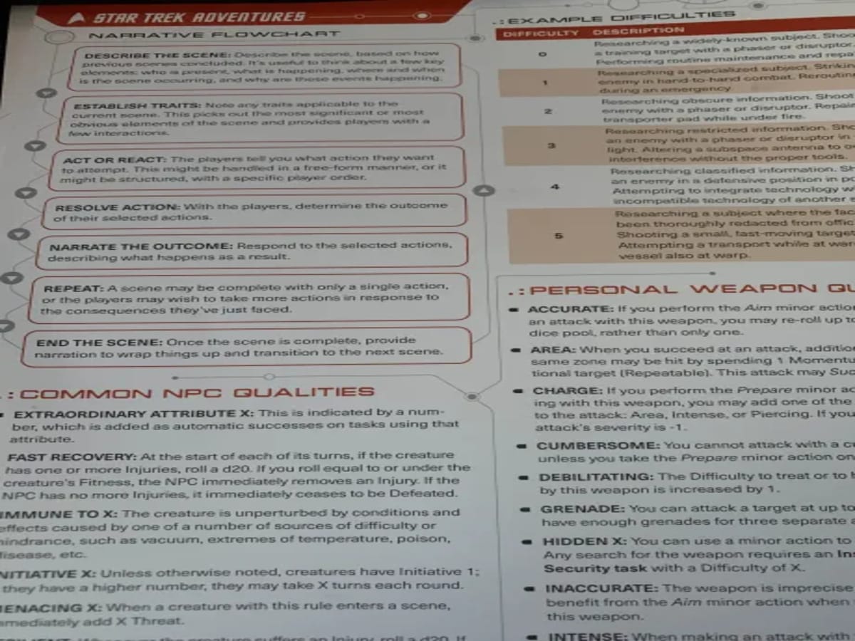 There is also starship combat, and frankly, a lot of rules revolving around starships. The included starship sheet is a must-use to make playing on one feel as good as possible. I have played Traveller and Starfinder and adore both of the games. But Star Trek Adventures has my favorite feeling of starship combat because it is not bogged down with too many rules. I love crunchy systems, but it seems that many times, when a game has any kind of vehicle, the mechanics tend to get bloated. I am happy to report that this game does not suffer from the same kind of bloat that I am used to seeing; it doesn’t have bloat at all, really. The cheat sheet is all you need after you read the rules to make this portion of the game run smoothly.