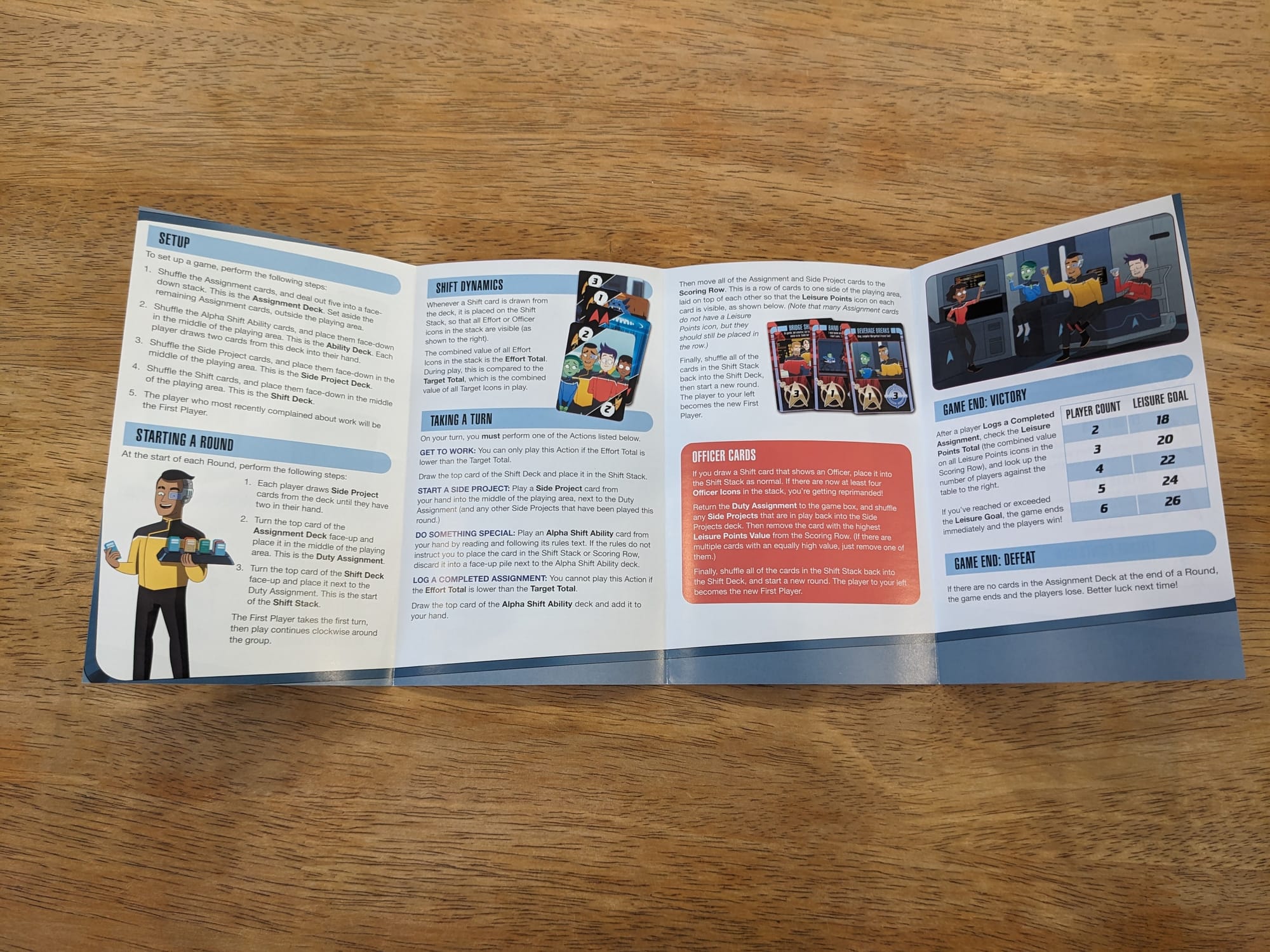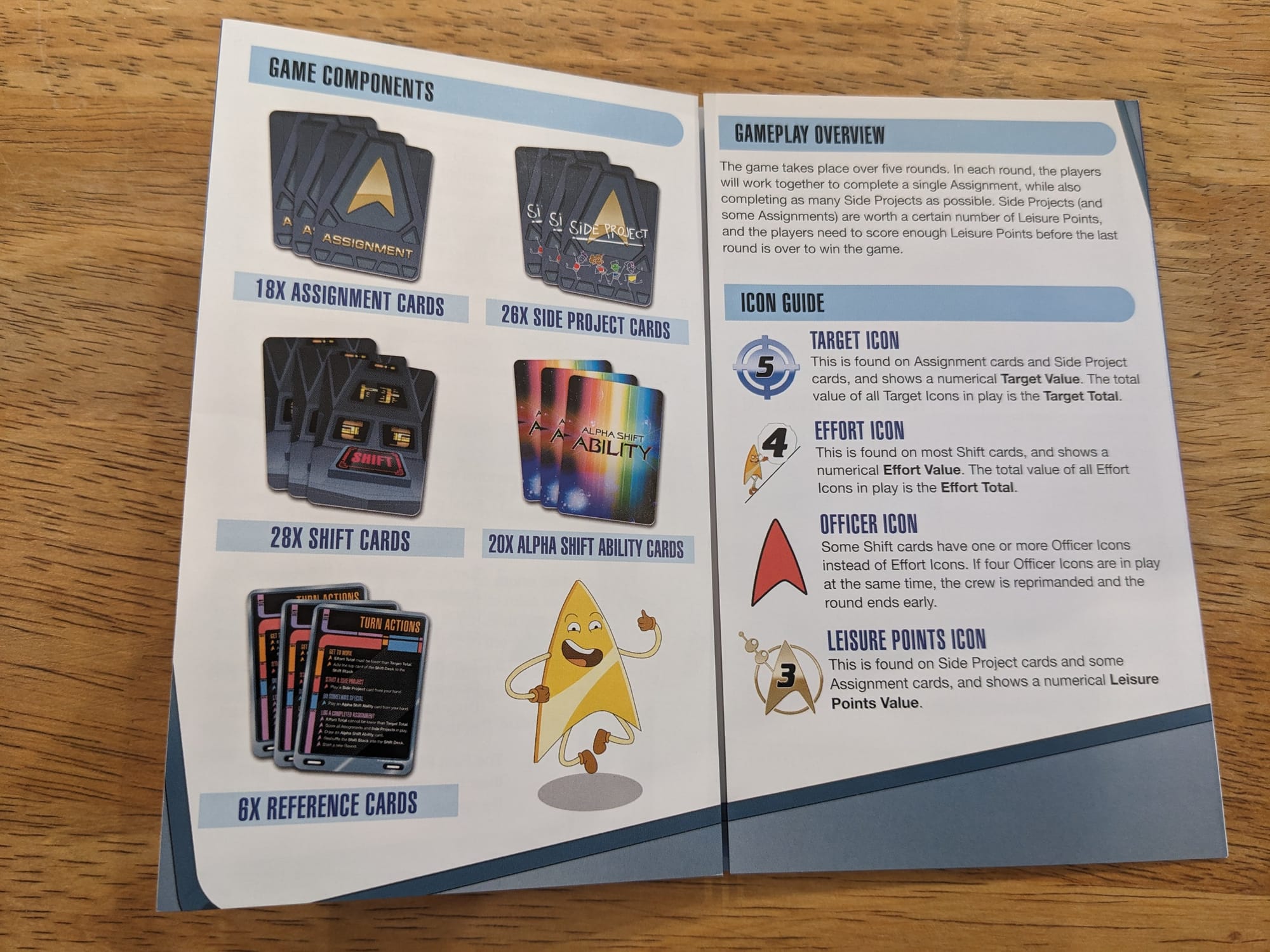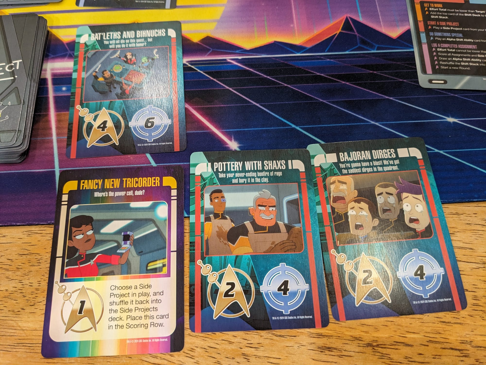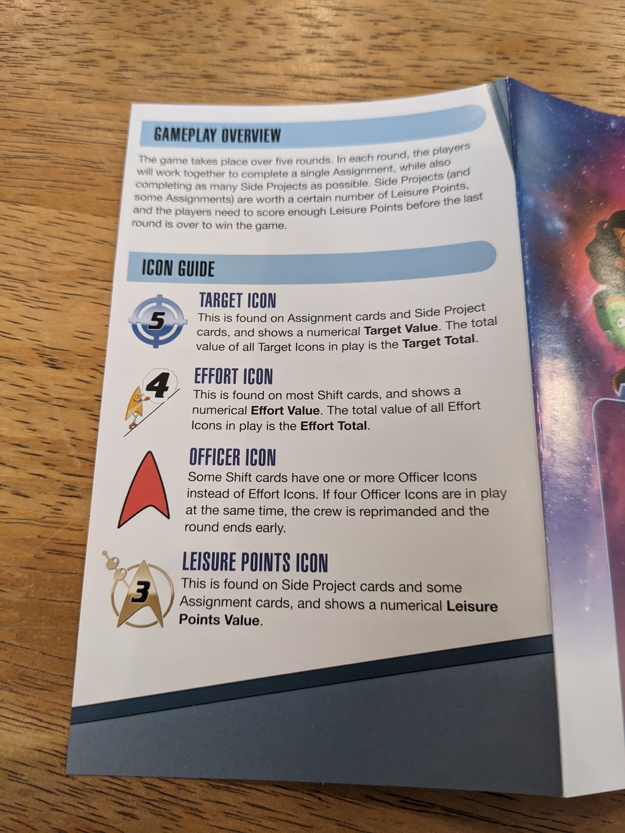 Players each take their turn going clockwise, performing one of the listed actions. Once all players have taken their turn, the round ends, so fewer players means faster rounds. The goal of the game is reach a certain number of Leisure Points (the Starfleet icon on the Assignment and Side Project cards) based on the number of players in the game; once you do that, the game is over and everyone wins! Leisure Points are obtained by completing Assignments and Side Projects by playing cards from the Shift deck onto a stack of Shift cards next to each assignment. There are individual Shift stacks for each assignment. As you play cards from the Shift Deck, you add their Effort Numbers (indicated by a number in a white circle) together to try and meet (or exceed) a Target total on the Assignment and Side Project cards (the silver target icon). A player's action can be to 'Log an Assignment,' which is to move the Assignment/Side Project to the score pile and shuffle all of the Shift cards back into the deck. You can have multiple Assignments going at a time, but you can only use your Shift Points once, applied to each active Duty Assignment, to score before they get shuffled back into the Shift Deck. If there are no cards in the Assignment Deck at the end of a round, everyone loses.