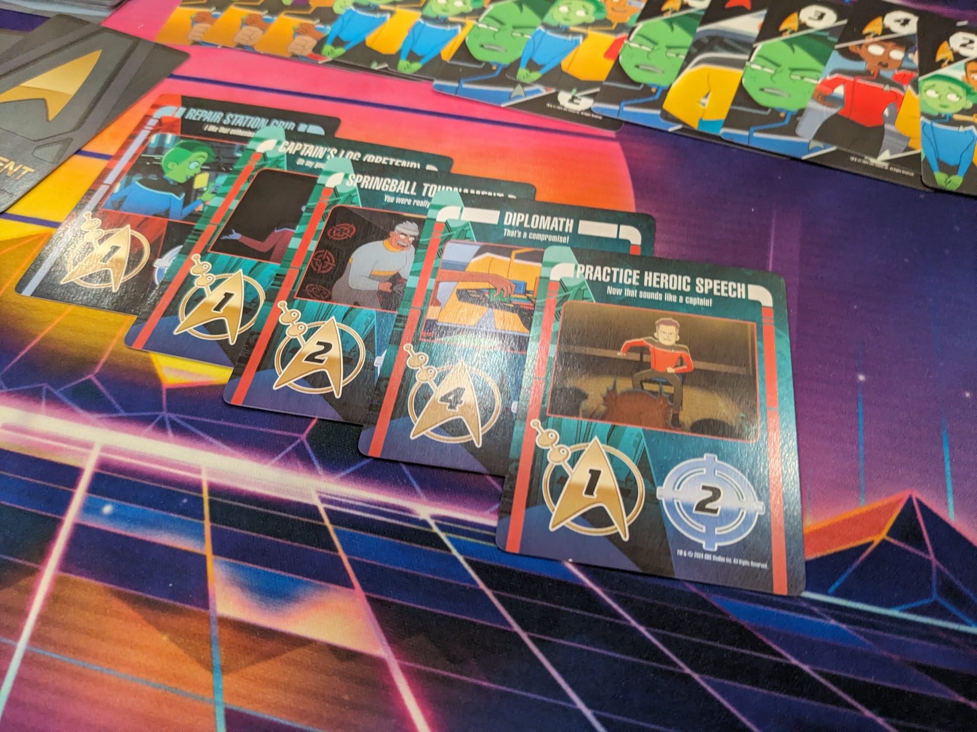 Enter Star Trek: Lower Decks Buffer Time! Based on the canonical and tongue-in-cheek cartoon of the same name, Star Trek: Lower Decks Buffer Time puts 2-6 players (scrappy underdogs) together, not to engage in space combat or wheel-and-deal at the negotiating table, but to instead complete menial duties and work on side projects aboard the USS Cerritos (the mid-level Starfleet ship from the show). Rather than try to capture the entirety of the Star Trek mantra in an overly complex game, Buffer Time circumvents the expectations and gets down to brass tacks (or self-sealing stem bolts), creating a simple and light push-your-luck card game.