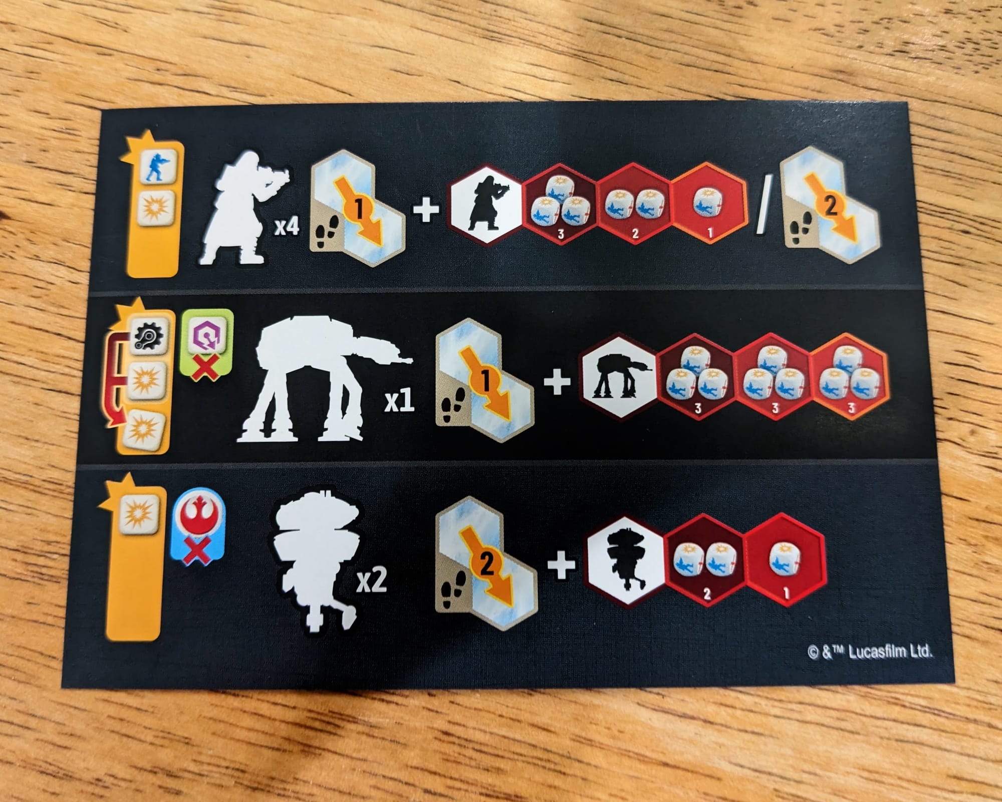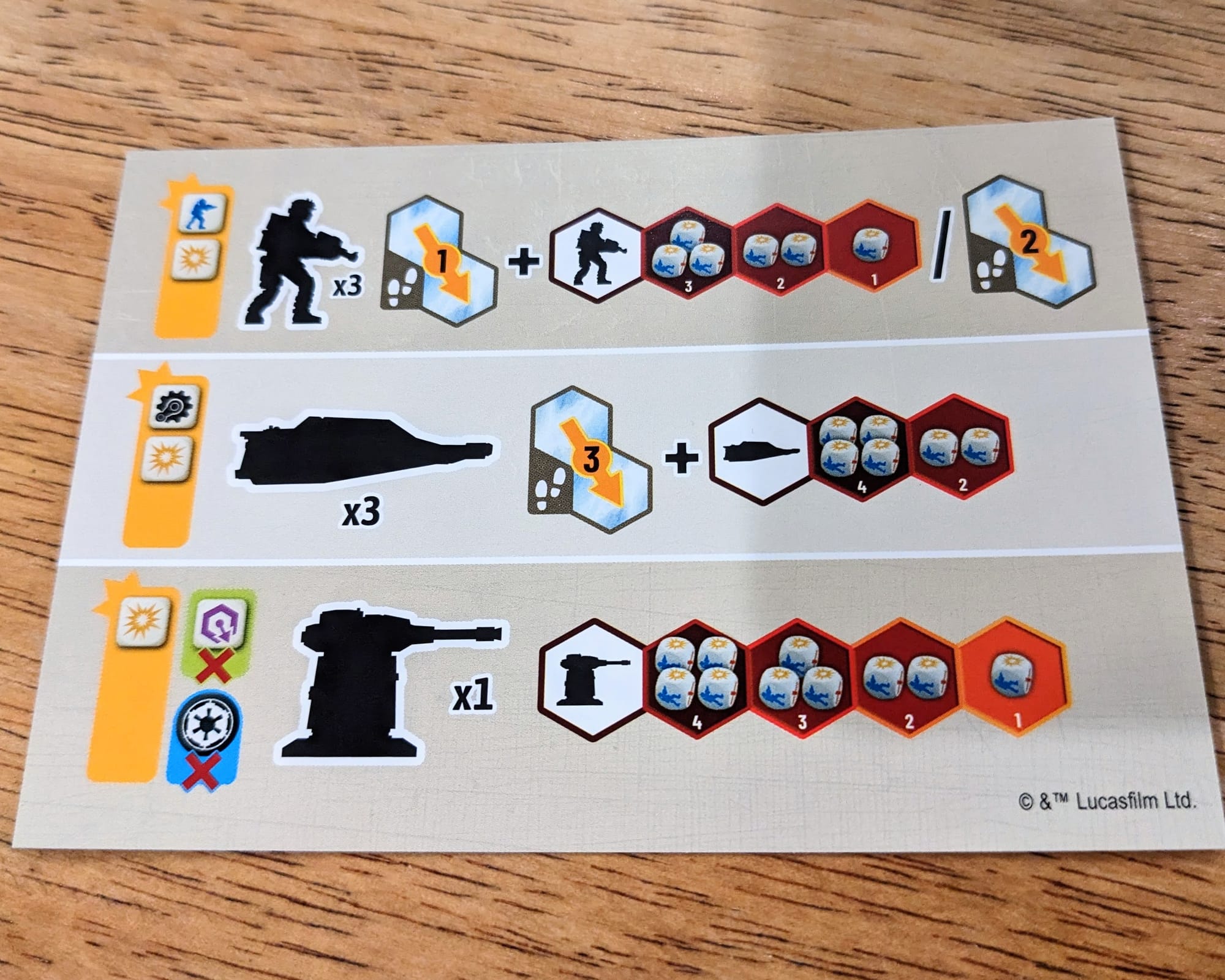The Rebel snowspeeders hit my right flank hard and fast, controlling the snowy hills in front of my units. Each terrain hex provides different game effects and is meant to help bring some hindrances to the board to help make combat more interesting. Hills reduce the number of attacking dice by one, making it hard to hit them. So, not only did he get a very effective alpha strike against me, but it was going to be a slog to take down those sp. In just a few rounds, even with me reinforcing my lost units, he had scored 3 Victory Medals.