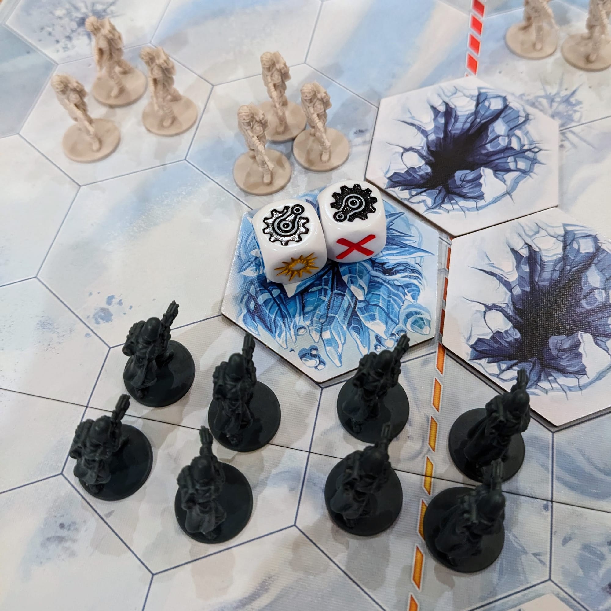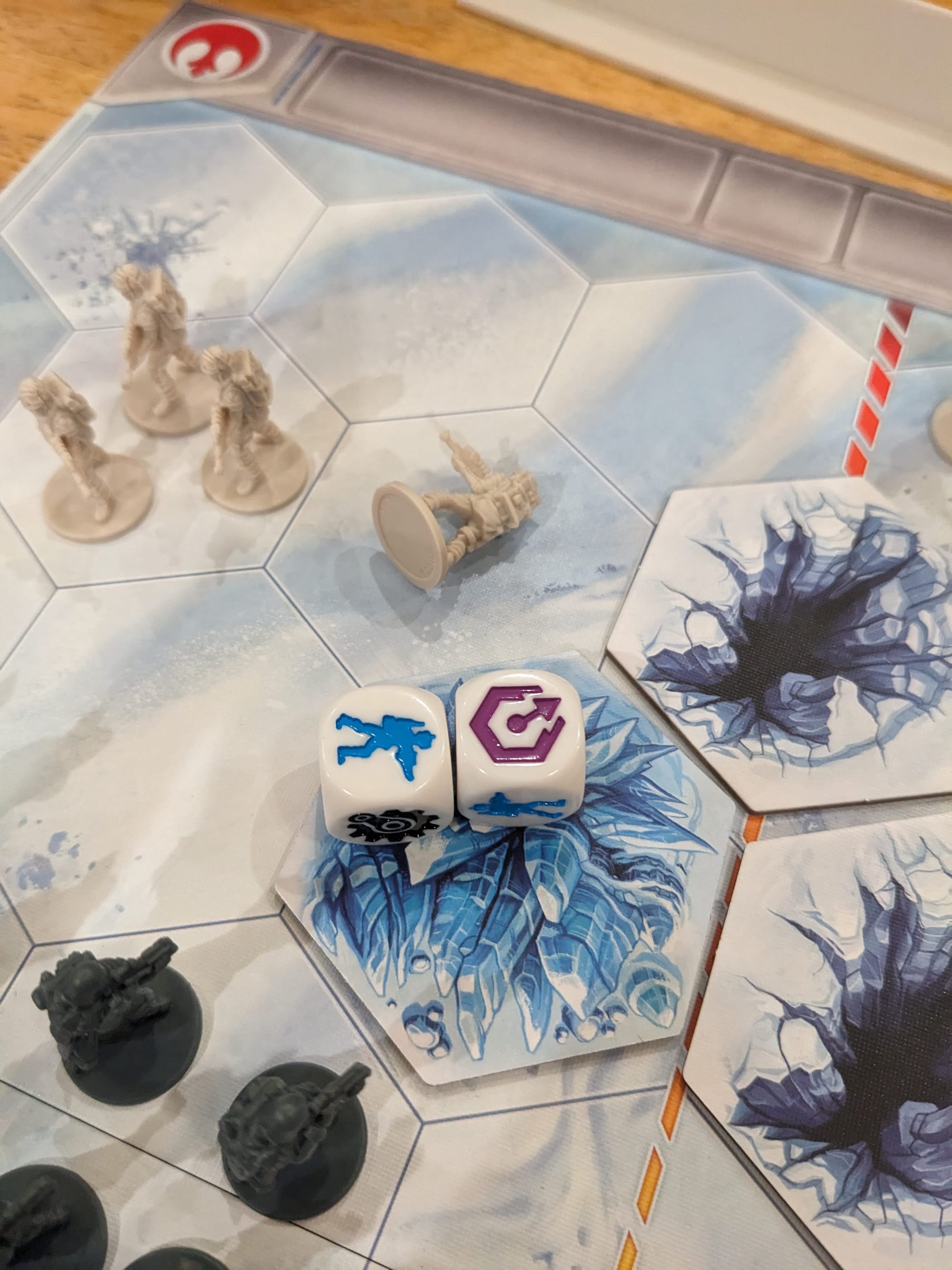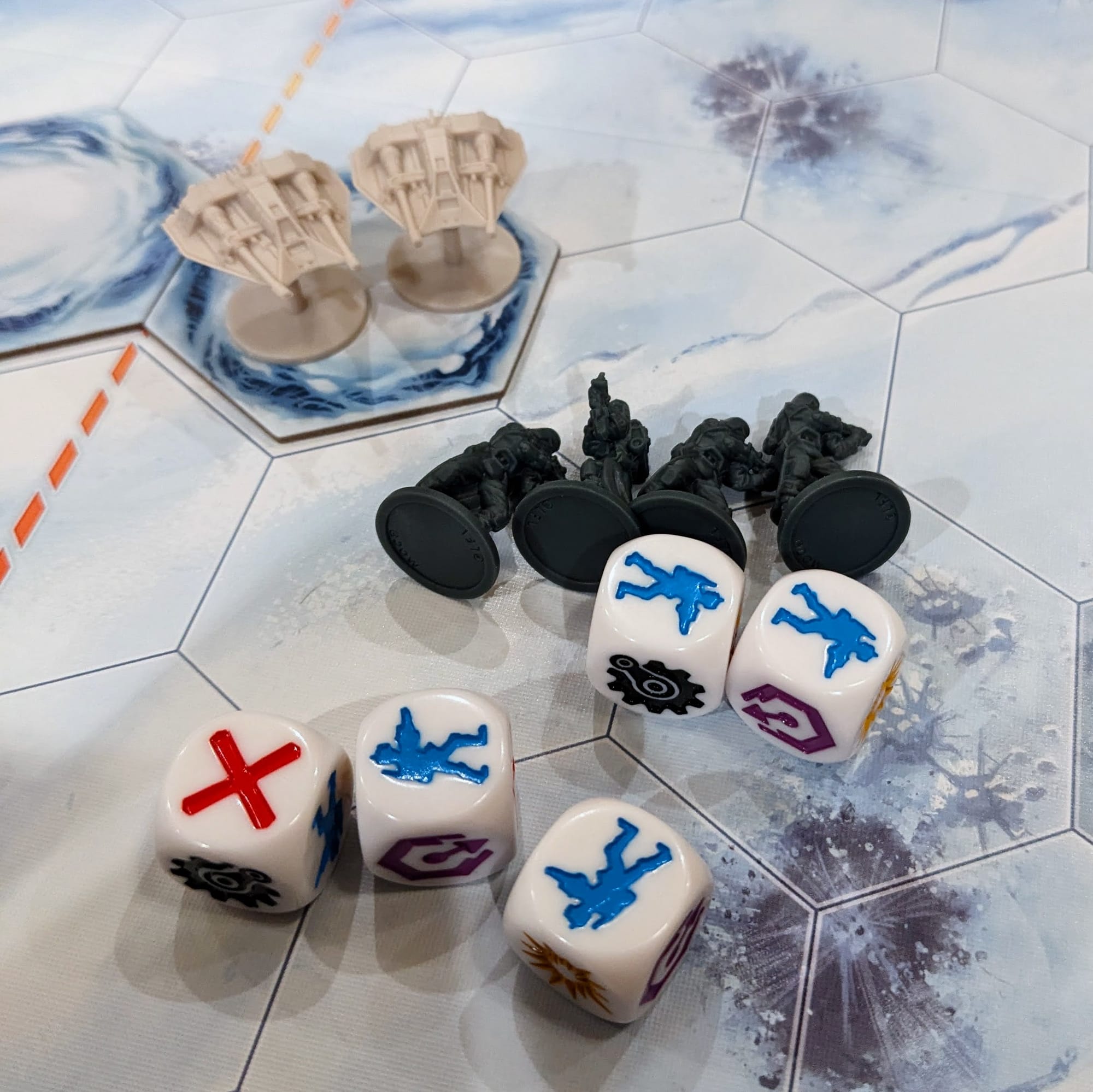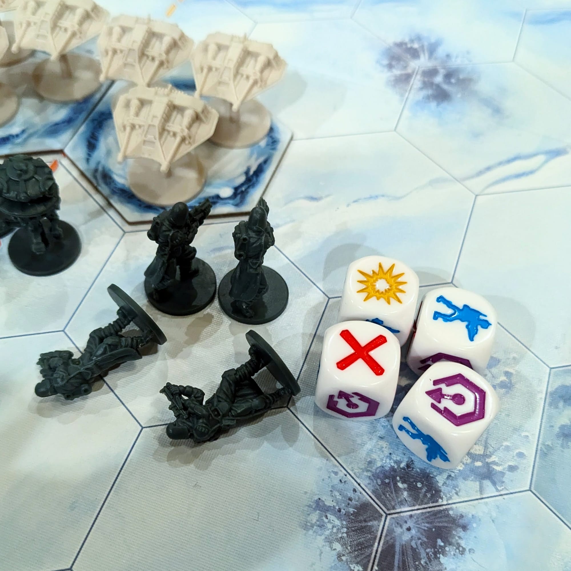 If you’re not familiar with the series, Memoir 44 and Battle of Hoth are miniature games, played on hex board maps where players alternate turns playing cards that allow them to activate units to move and attack, limited by a zone or a unit type. The cards, randomly drawn each turn, help create the chaos of the battlefield, but also help reduce the ‘analysis paralysis’ of standard wargames of having too many options. Units have very simple activations: they move and they attack.