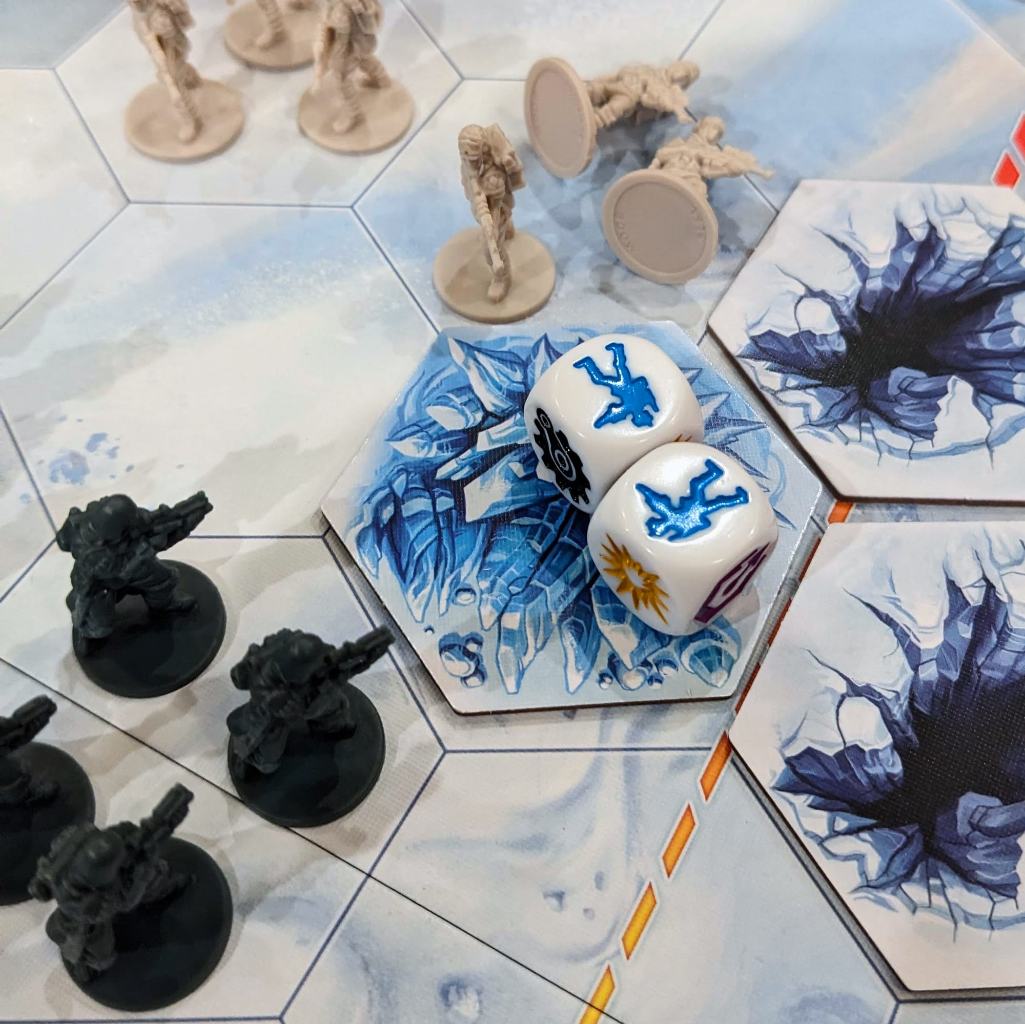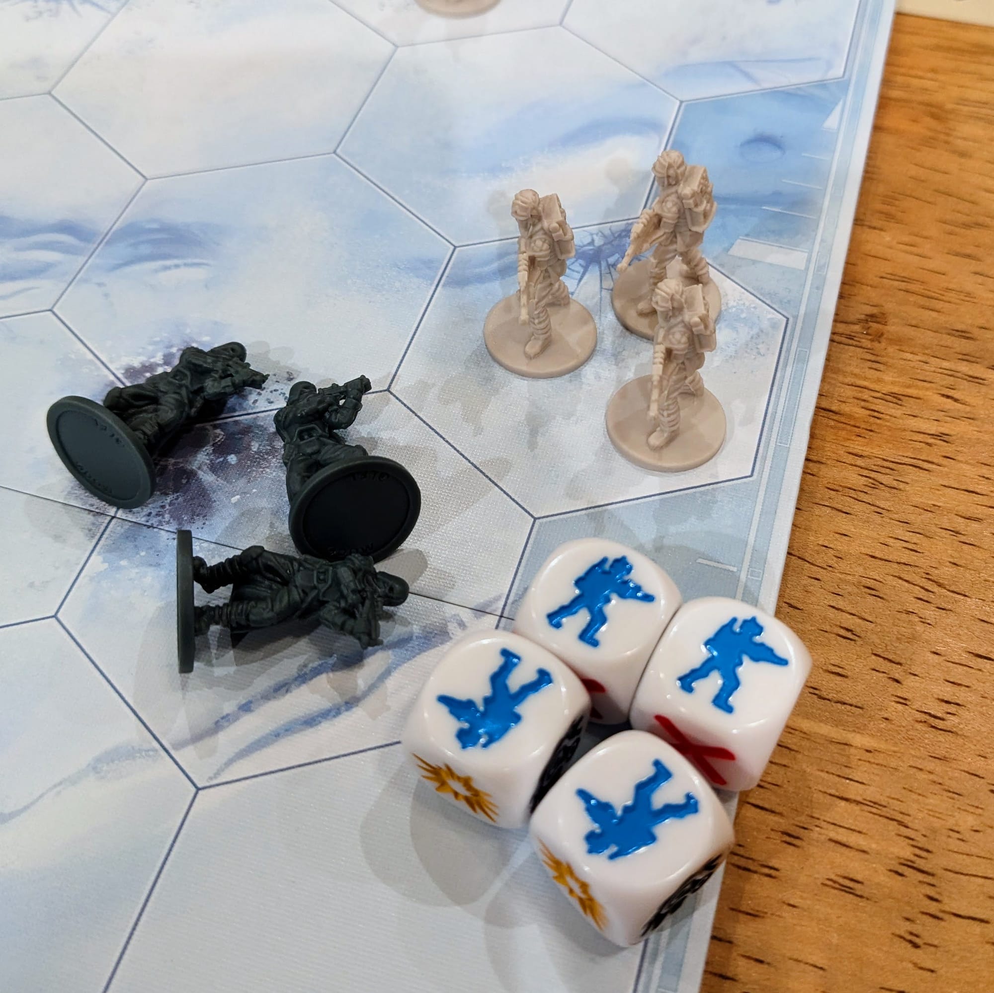 When in combat, players roll dice to determine hits on enemy units. Enemy units do not roll dice, which keeps gameplay fast and light. Units are composed of miniatures, which are effectively health points, whose combat effectiveness is not affected by the removal of units from combat (i.e., a squad of 4 infantry miniatures rolls the same number of dice as a squad of 1). Different units have different movement, attack strength (the number of dice rolled), and defensive stats (what symbols on the dice cause them damage). Range is a factor in all wargames, and so, in general terms, the farther a unit is away from a target, the fewer dice it rolls. Units in an army are determined by the scenario.