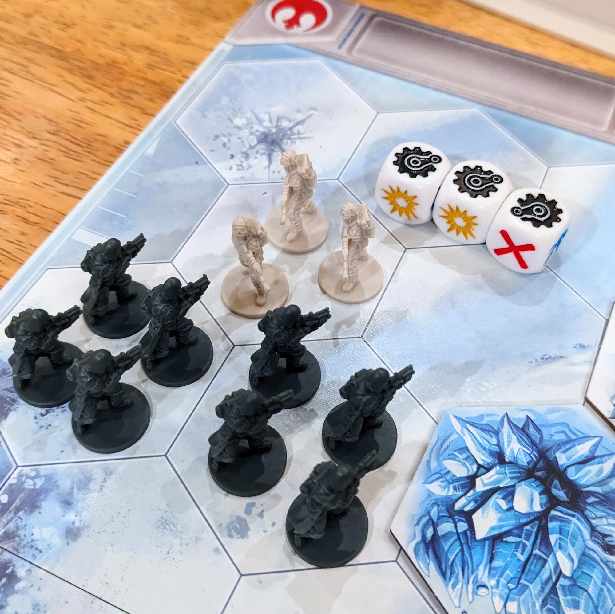 Once the board was set up, cards sleeved, and minis nearby at the ready, it was time to jump into the game. My good friend (equally, if not more, an avid Star Wars nerd) and I set up for the first scenario and managed to throw out some solid puns and references to get ourselves in the mindset to battle on the snowy plains of Hoth. Just like in the movie, the first scenario is about finding those probe droids and destroying them.