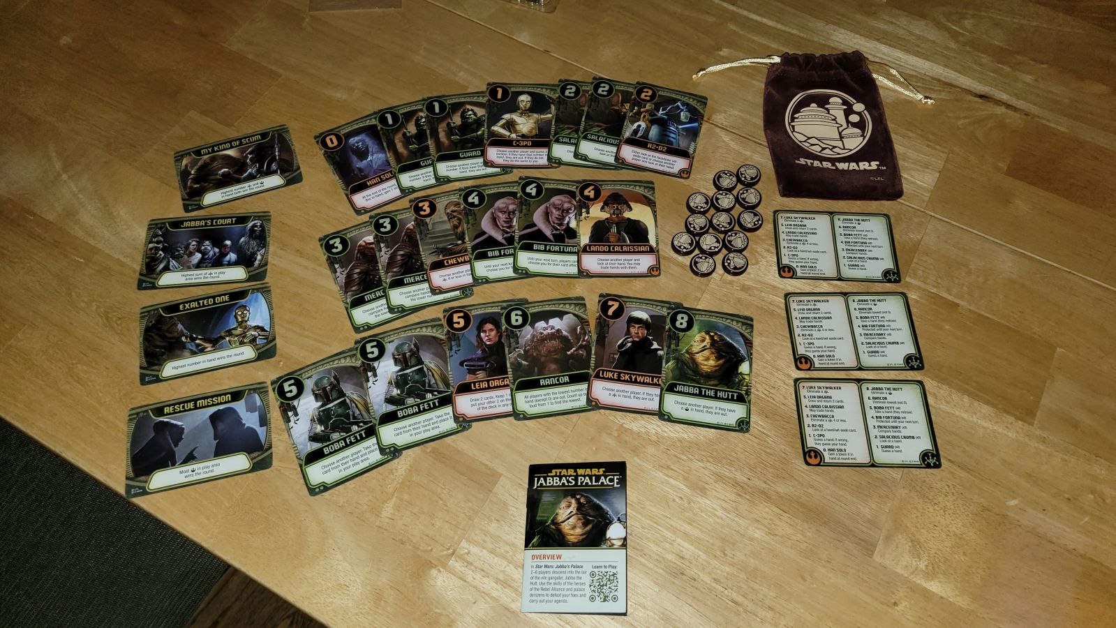 Why would I care about agenda cards anyone might ask? Well the agenda cards provide a fresh and new way to win Love Letter rather than just outlasting your opponents round after round. Each Agenda card is specific in its text and tells players how they might win a round instead of being the last one standing. Unlike your typical version of Love Letter, Jabba’s Palace presents players with cards numbered zero through eight, instead of cards numbered zero through nine. What sets these cards apart from the classic game, is not only are the cards numbered like normal without a number nine to be the princess, but there are seven cards that have orange(rebels) borders and numbers to them while the other 12 cards have green(hutt’s) borders and numbers.