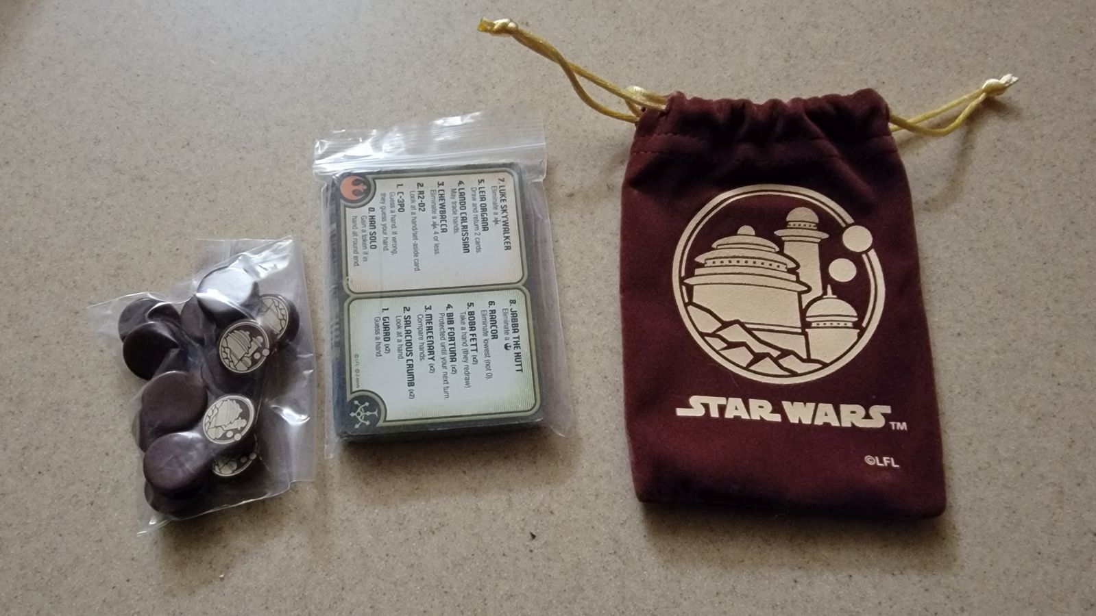 In this beautifully crafted game, Jabba’s Palace is a welcome and inviting yet familiar backdrop for one of the better filler type games that is available in today’s board game market. From tokens that contain little images of Jabba’s Palace, with the classic Love Letter burgundy that is so recognizable, to classic yet amazing art for the cards, anyone who is a Star Wars fan or a Love Letter fan is sure to enjoy this game.