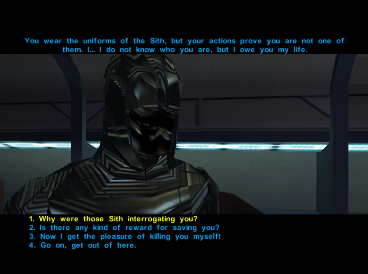 Upon meeting a new character in KOTOR, you could either greet them politely or threaten to murder them and their entire family, which I found simply baffling. It is in these choices, however, that KOTOR really shines. Thanks to this, no two players will ever have the same playthrough as the game provides many avenues for completing a quest. For instance, in a section in Tatooine, you meet the chief of the local sand people and are immediately able to insult him, leading to discord. You’ll still be able to accomplish your goals in Tatooine despite your disrespect, but you’ll have to fight hard to do so, whereas sucking up to the same chief makes things a hell of a lot easier.