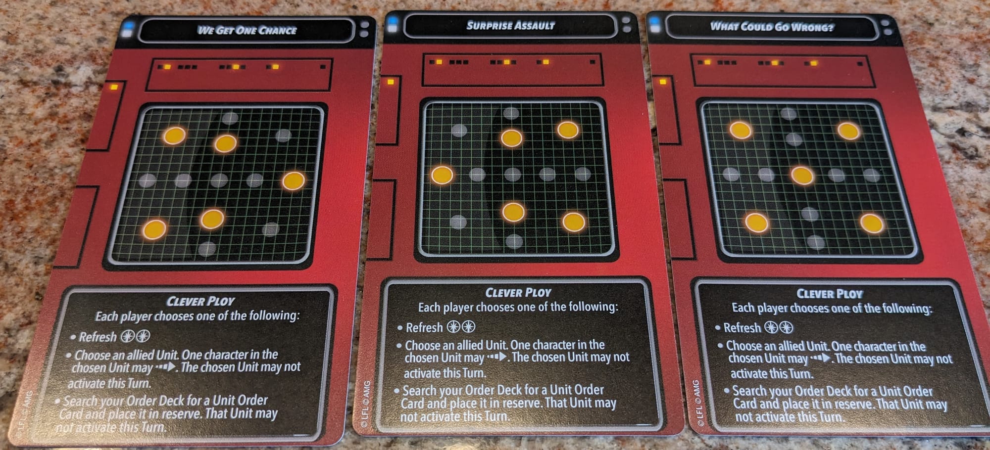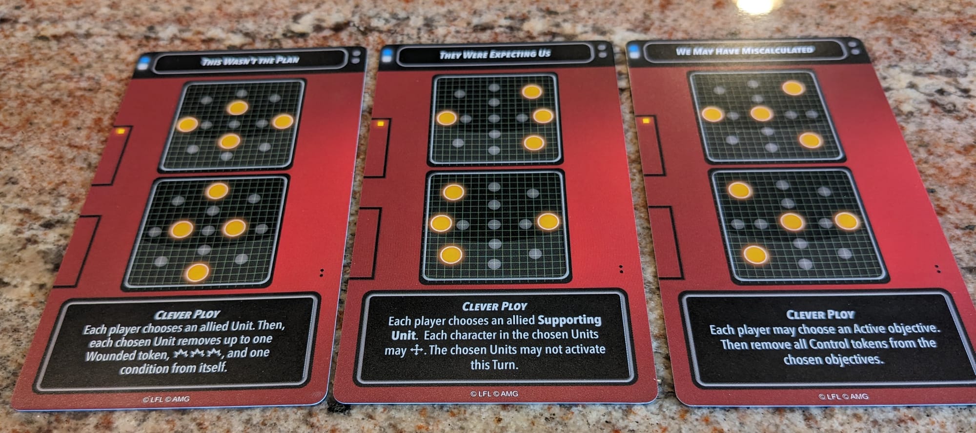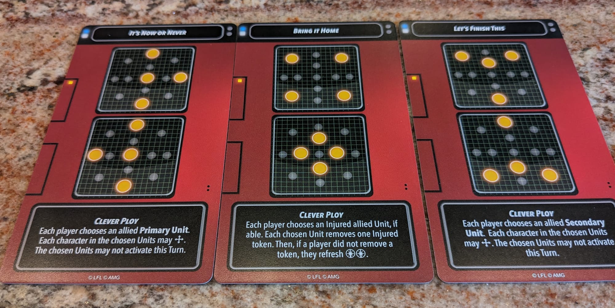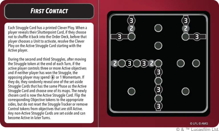 Clever Ploys - When a player reveals their Shatterpoint Card, if they choose not to shuffle it back into the Order Deck, before that player chooses a Unit to activate, they resolve the Clever Ploy on the Active Struggle Card (starting with the active player). First Struggle is the same, but Second and Third Struggle cards each have their own Clever Ploy in addition to the active objective token location. During second and third Struggles, if the active player controls three or more Active objectives, the opposing player spends 1 momentum and then randomly reveals one of the set-aside Struggle cards of the same phase, choosing one of the maps on the card. Players then flip the corresponding objective tokens over.