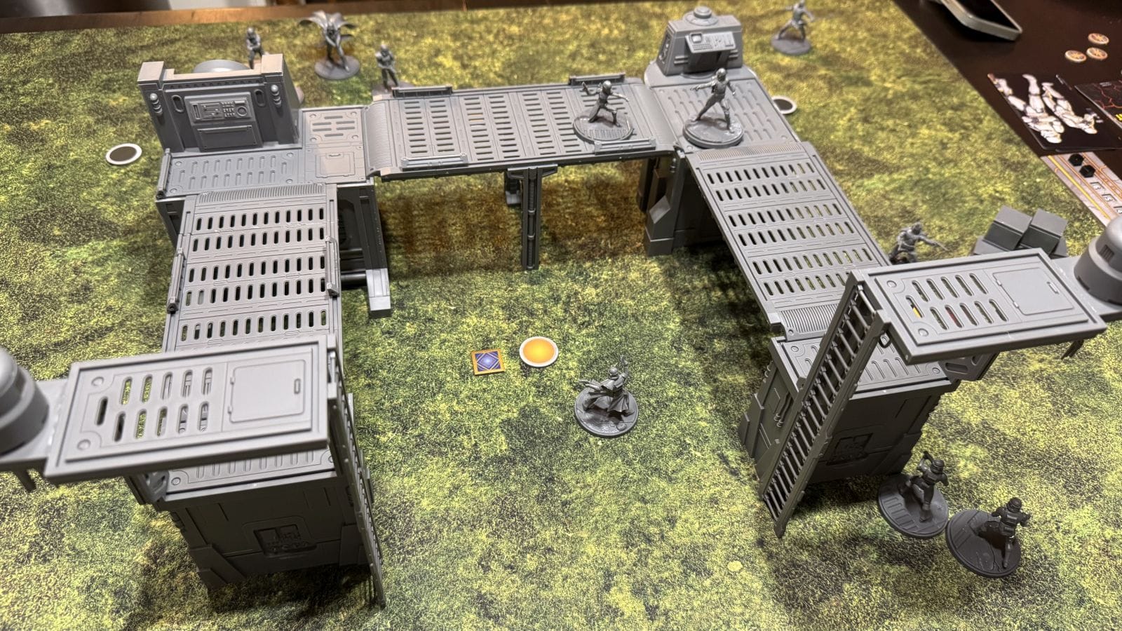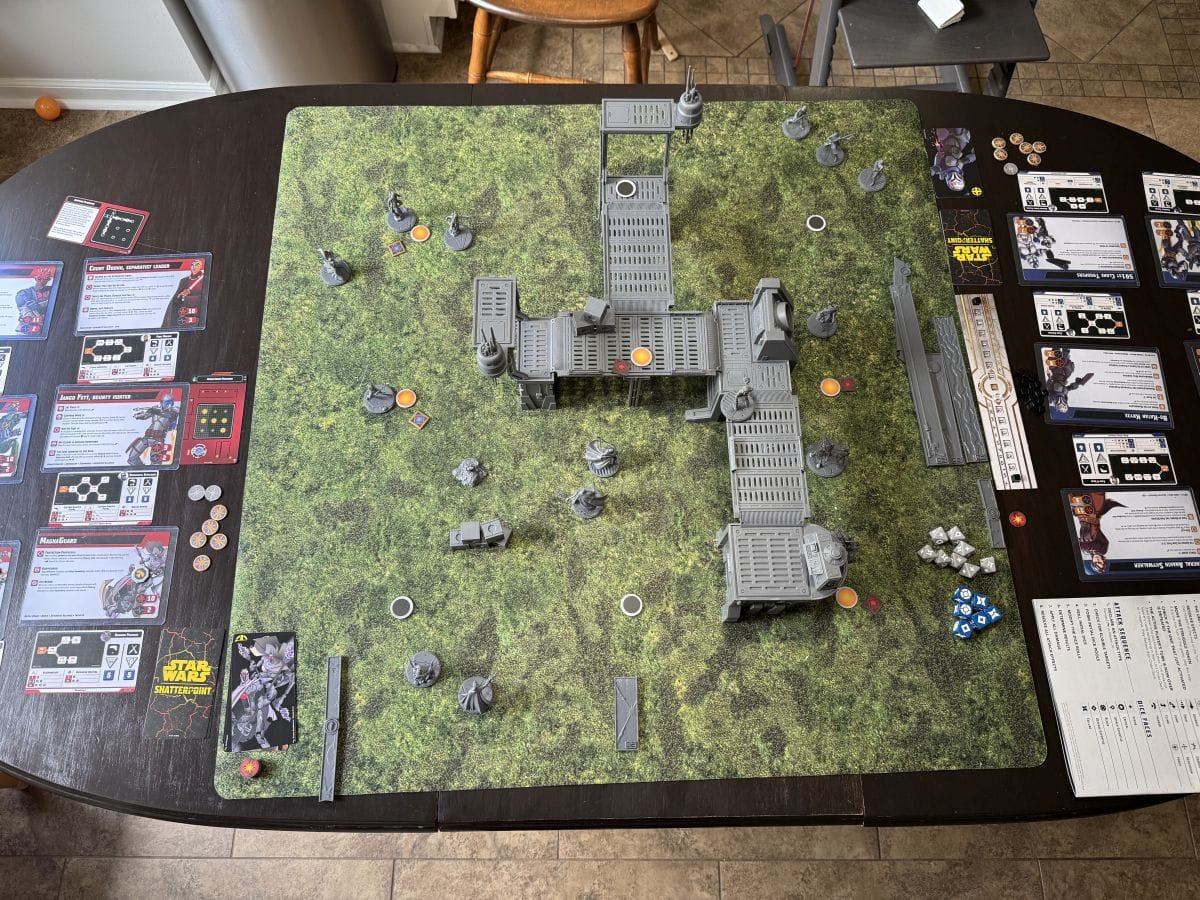 Now that you’ve assembled the minis, it’s time to play. Shatterpoint is played on a 3’x3’ battlefield that is best when filled with terrain. The core set comes with a set of terrain to get you started, but ideally, you’ll want to fill the board in some more to really take advantage of the cover rules and movement potential of characters. Elevation is critical to controlling objectives and affects line of sight and movement as well. The movement rules and unit abilities make the terrain a dynamic part of the game, not just a pretty decoration. It’s worth noting that all of the unit cards and combat trees will take up another couple of square feet of space, so a nice big table is pretty much a requirement.