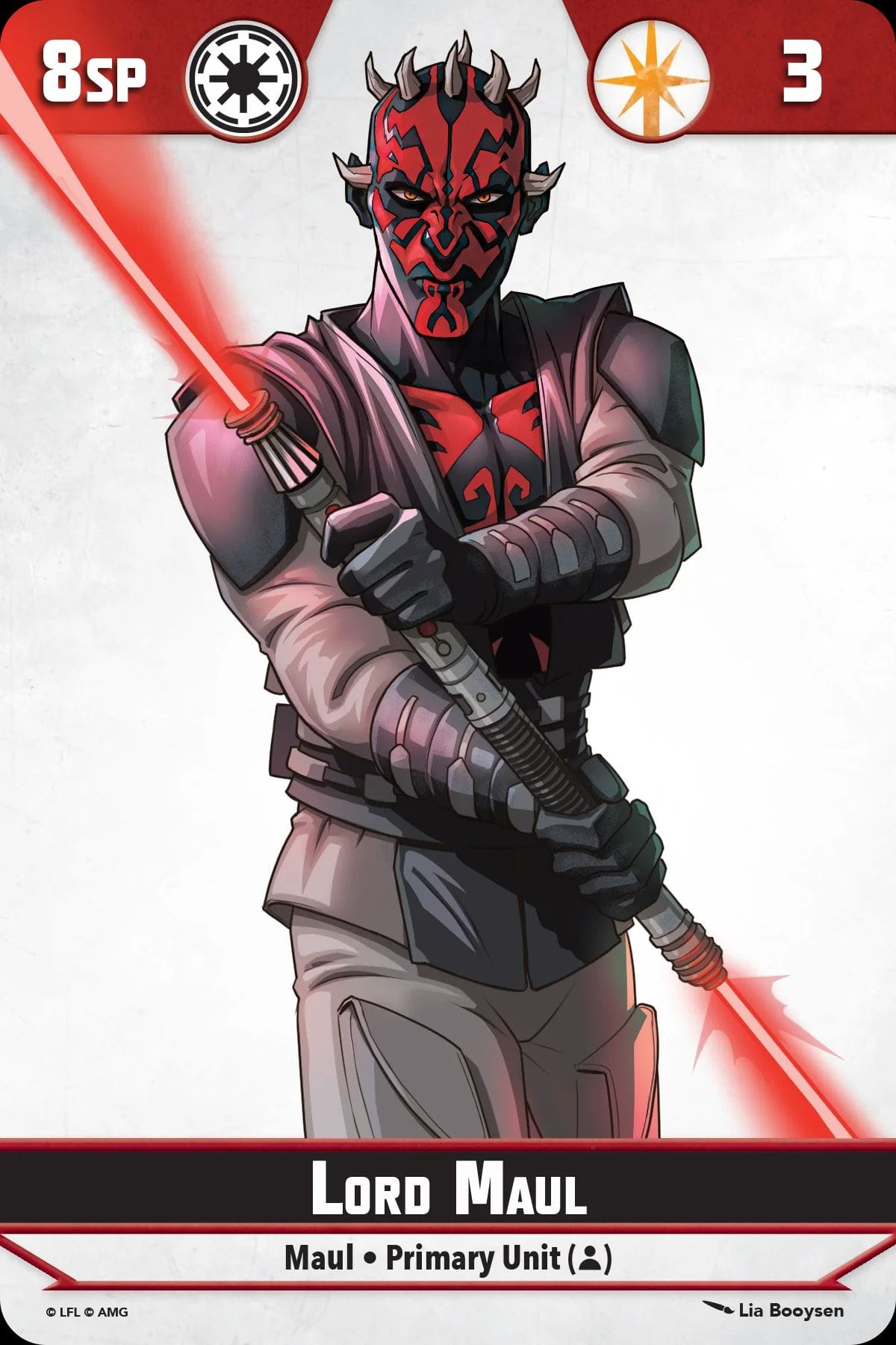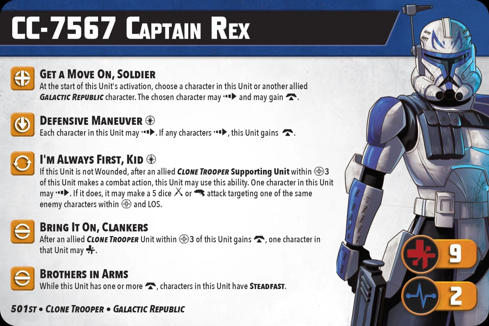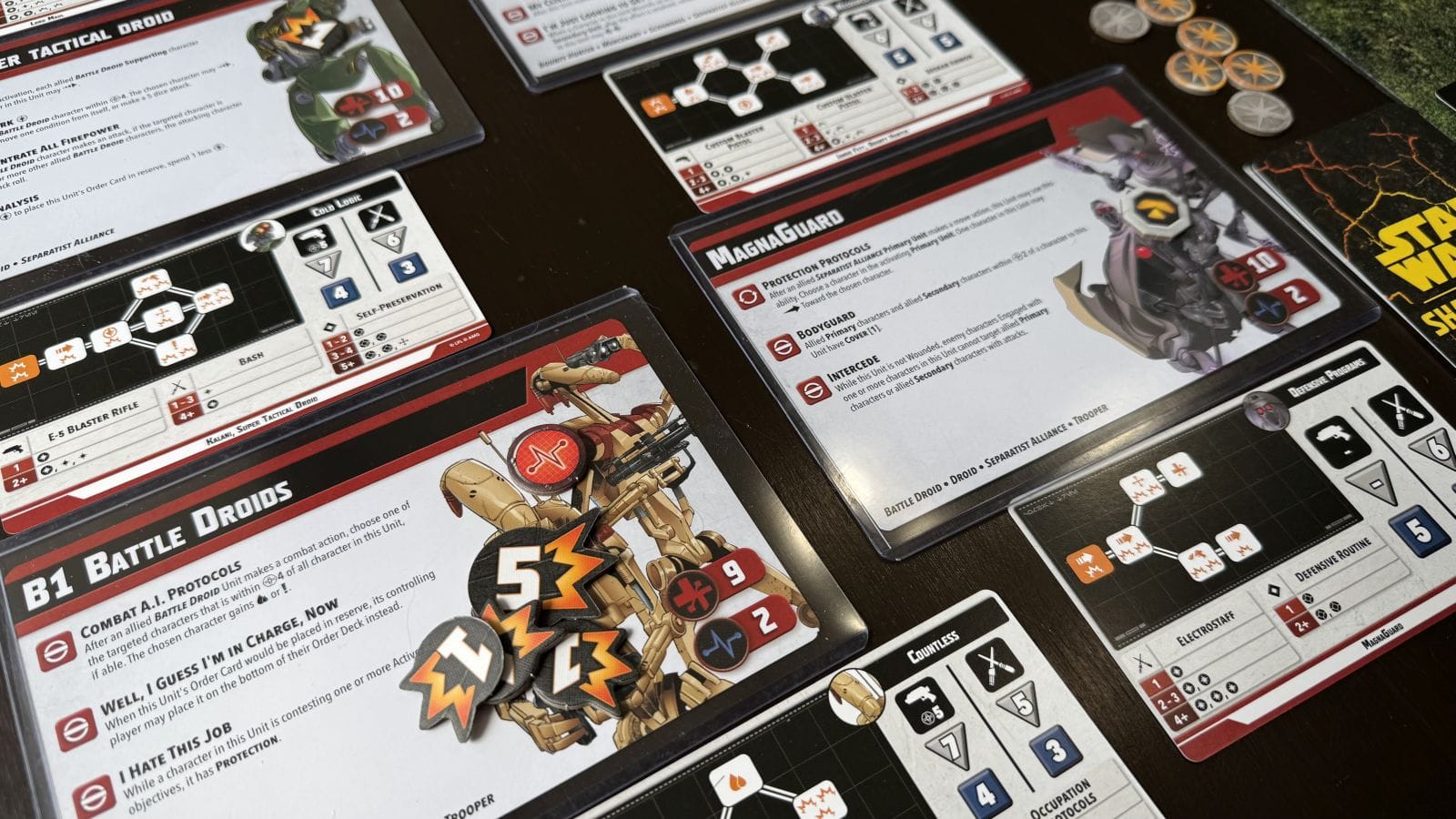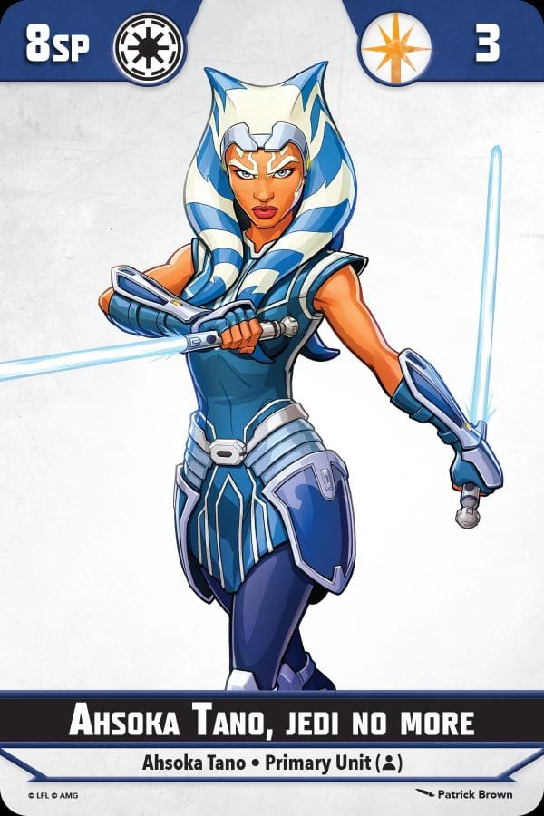 Primary units are the heroes and villains you’d expect. In the core set, you’ll find Anakin Skywalker and Ashoka Tano representing the Galactic Republic/good guys and Darth Maul and Asaj Ventress for the Separatist Alliance/Bad guys. Secondary units are notable characters like Captain Rex, Jango Fett, Gar Saxon, or Bo Katan. Supporting units are the rank and file soldiers like B1 Battle Droids, Clone Troopers, Magma Guards, or Mandalorians. You can mix and match units with a lot of freedom, but most units feature keywords that make them better when paired with the units they would thematically go with. The use of keywords is a great way to allow freedom but encourage thematic squads that enhance the overall game experience. Sure, you could have Darth Maul, Captain Rex, and B1s in a Squad together but it would just be wrong, ya know?