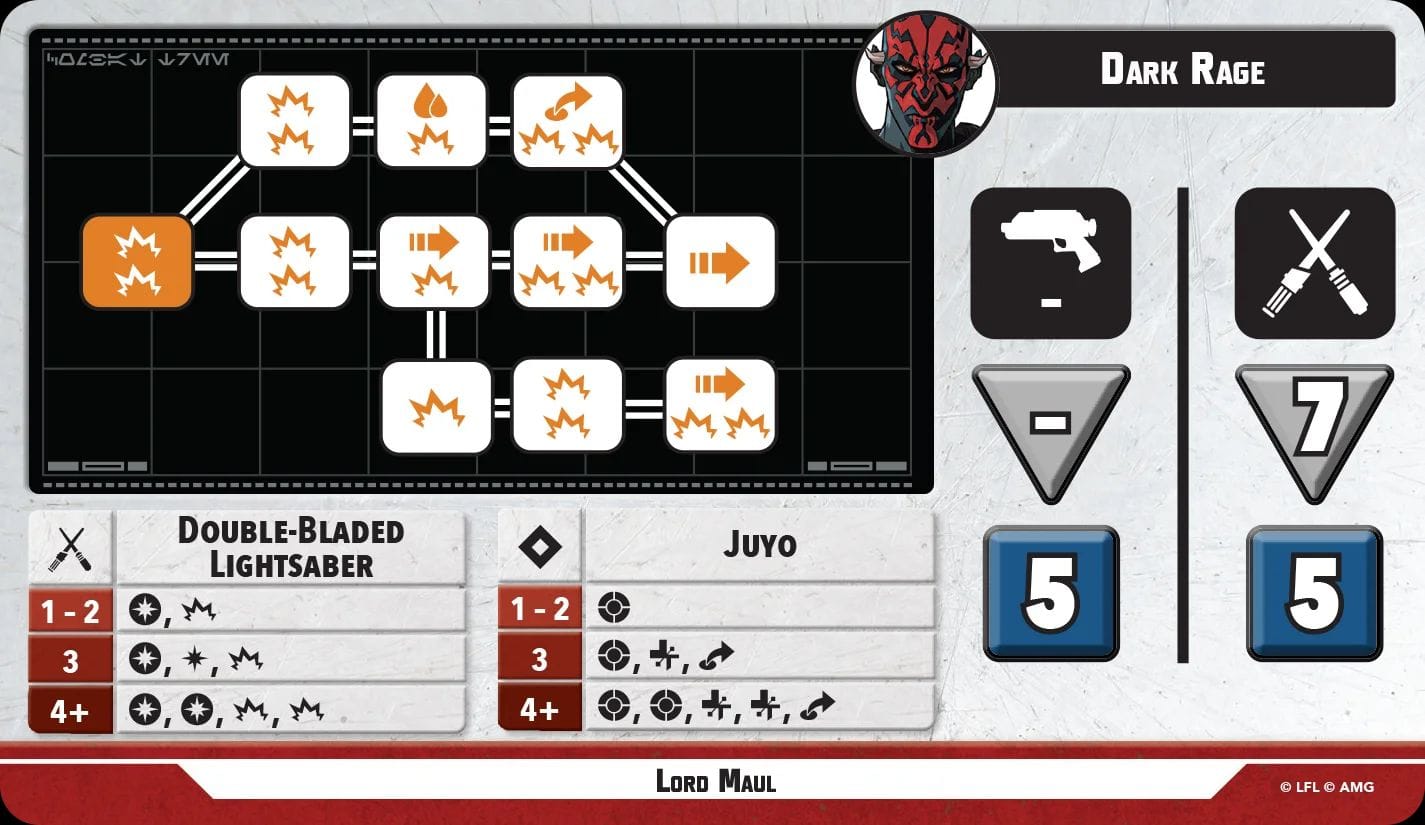 Combat in Shatterpoint is where the game really shines. You have your typical attack and defense dice, but they do so much more than just compare numbers. Both attack and defense dice feature success and failure symbols, but they also have Expertise symbols that let you activate additional abilities of your weapon or armor, modifying dice or even providing extra actions depending on how many you roll. Once you compare final results, for every hit that goes undefended, the attacker gets to activate a space on their combat tree. The combat tree determines what actually happens; dealing damage is only the beginning. As an example, Ashoka actually has two combat trees depending on which lightsaber form you choose to use. If she made an attack with four strikes going through, it could look something like: damage and shove the defender away, heal two, another damage and another shove, followed by two more damage and a jump for Ashoka. While this all may look complicated the first time you see it, it makes for very dynamic and engaging battles. The combat trees allow the characters to feel unique and are a really clever design tool to push thematic combat skill into the design without overburdening the game with a ton of unit-specific rules.