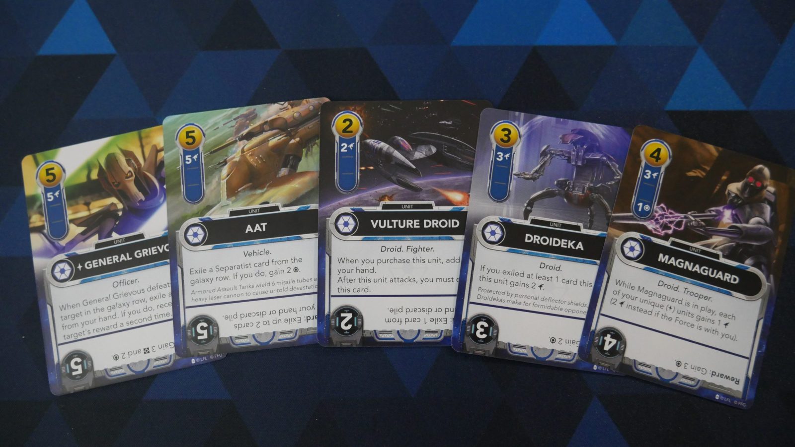 The Clone Wars Edition factions play differently than the original version of the game. The Separatists use expendable droids to throw a constant onslaught of damage across the table. To make it interesting, you don’t have a huge pile of droids but instead, manipulate your deck and the market row via the exile ability to power up turns and then bring droids back from the trash pile to fight again. Supplemented by fan favorites like General Grievous, Count Duku, and Asaj Ventress, the Separatists’ play style offers a lot of opportunity for strategic play and constant pressure on your opponent.