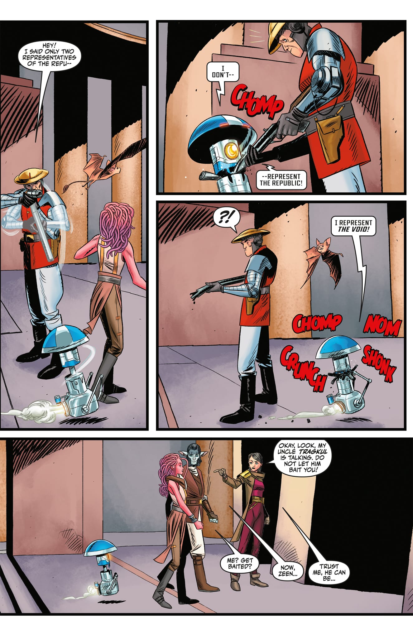 As her eyes move from hologram to hologram, she becomes bothered at the inclusion of those not officially confirmed dead, particularly when she sees a particular person included: Lula Talisola, a Jedi who was on the Starlight Beacon when it fell. Zeen refuses to believe Lula is dead, despite her having not been seen or heard from in a year. So, with the help of Jedi Knight Qort, she sets off to find her, leading to a big twist at the end of issue #1 that kicks off the rest of the series. And what a series it was.