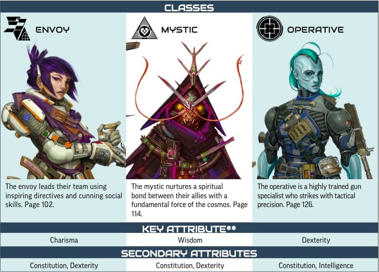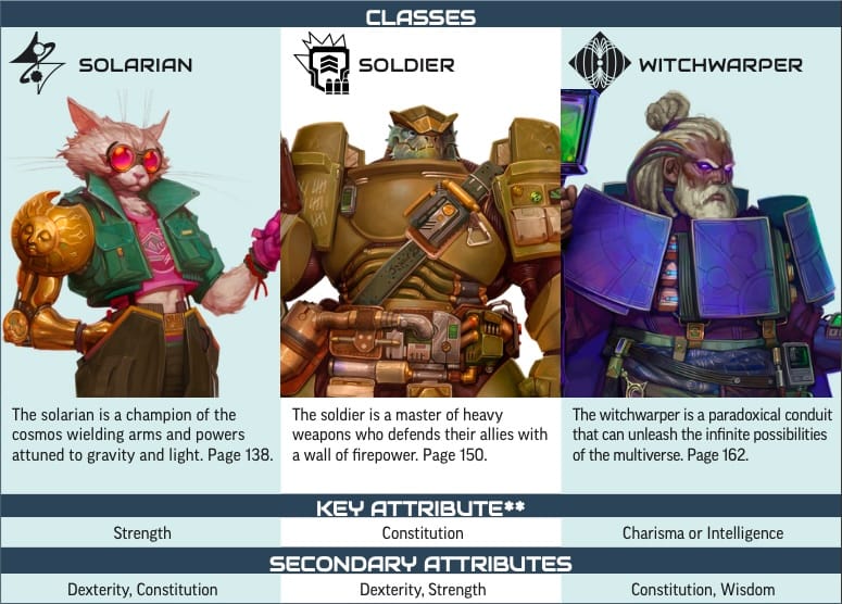 Dan: Classes are where the real fun happens. Each class is basically the career and lifestyle a character leads with different abilities and even subclass options to hone in on character expression. For example, an envoy is a master influencer that could be a politician or a con man, I’ll bite my tongue with that comparison, who uses their words to get them through situations. A soldier is the ultimate damage dealer and soaker in combat and someone who takes the lead in battle. A witchwarper is a magical being who manipulates physical and alternate planal energies to exert their will. Each class can have unique class abilities and feats to choose from as players level up and players have six different classes outlined in the Player Guide.