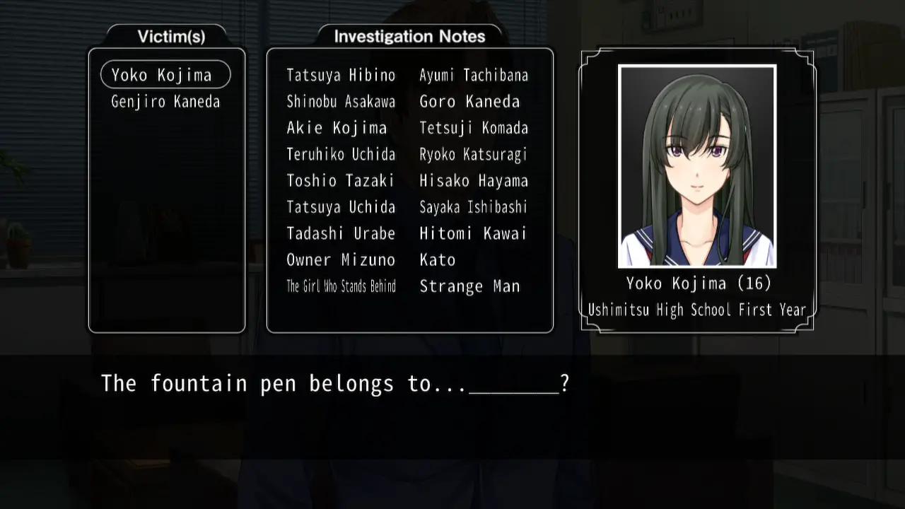 The game is a lot like a visual novel with some adventure game elements. There are a few dialogue choices that don’t really affect anything, so the interactivity comes from menu navigation. When investigating a location or interrogating a suspect, everything you can do is listed in a menu in the top left corner of the screen. These can range from moving to another area, asking someone about a person or concept, looking at your surroundings or an object, to simply taking a moment to think. On paper, it’s nice to have so many options to progress the story, but in practice playing the game is like having to guess a password every few seconds. For example, you might be confronted by a school bully who mistakes you for the killer. To reason with him, you would think to show him some evidence like Yoko’s, the victim, school ID or just talk to him, but to actually progress you have to look at his face using the cursor by selecting “Where?” in the look menu, then talk to him. The game constantly puts nonsensical roadblocks in your way like this, when all I want is to get to the next scrap of dialogue.