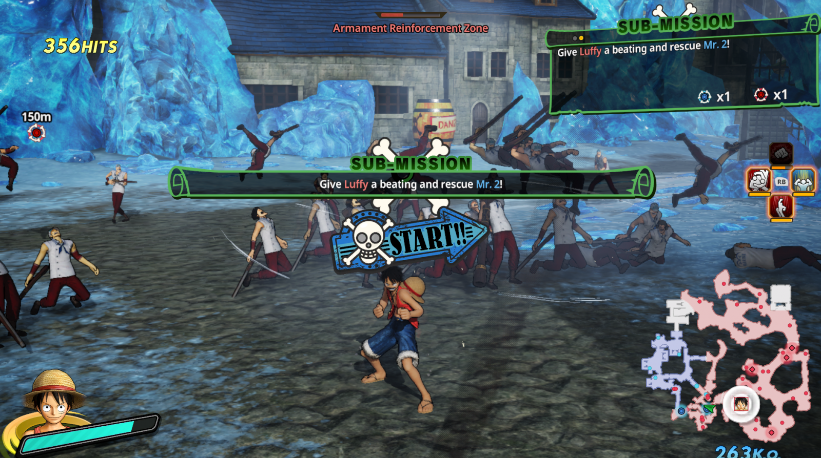Jumping into battle, regardless of the character you choose (usually you will be given a choice before starting the mission), you will be accompanied by a few of your Straw Hat cohorts. While you will be doing most of the heavy lifting, it does add something to the gameplay to see friends fighting alongside you. There’s a lot of dialogue that takes place as you pummel thousands of pirates yelling shiver me timbers. Unfortunately, because this is a fast-paced game, much of what’s said gets lost. And that’s where my first complaint comes in. The User Interface is terribly dated –feeling like a circa-90’s imported Japanese game.