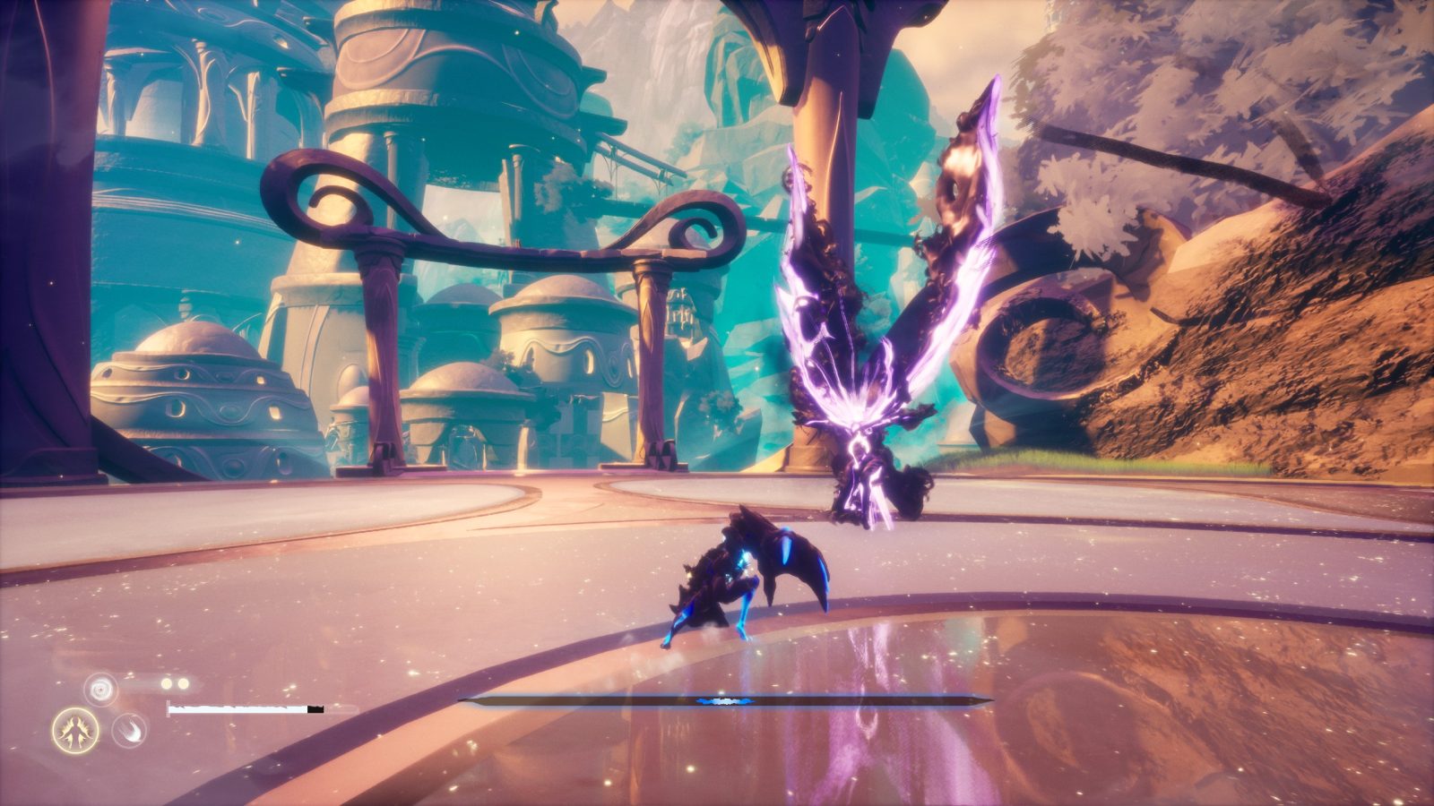 Some attacks will be purple rather than blue or orange, and those you’ll need to dodge instead of parry. I do find that these types of attacks happen a bit too often for a game where the enemy sets the pace of combat rather than the player, and it often leads to me getting impatient and just tanking the hit to build meter with attacks. That could very well be the point, but sometimes an enemy will just be purple for several, lengthy attacks in a row which gets frustrating.