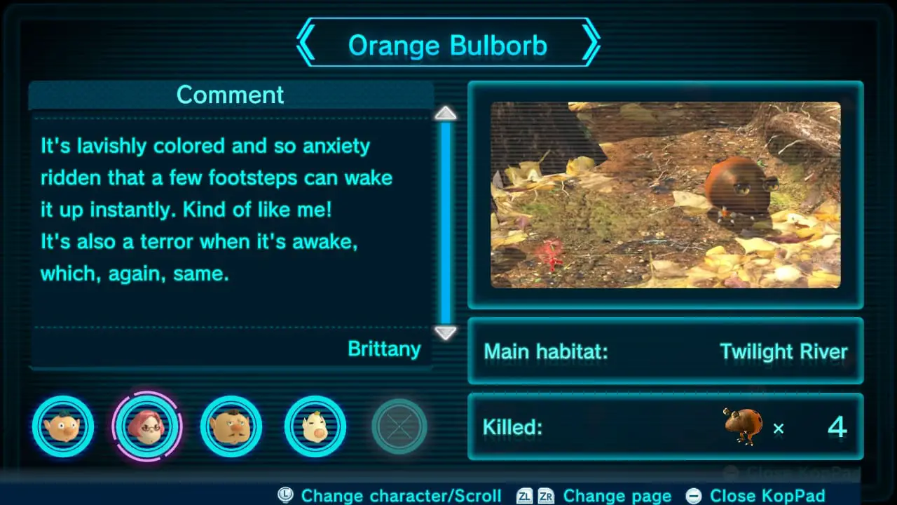 Another addition to the game is personally one of my favorites, the Piklopedia. Returning from Pikmin 2, this has every captain in the game remarking on every creature they encounter. Alph, being the engineer that he is, often talks about the structure of the creatures and their weakness, while Brittany’s are a little more silly. Charlie will often talk about the creature’s fighting power, being the strong captain he is. The other two are unlocked over time, but they are equally enjoyable.