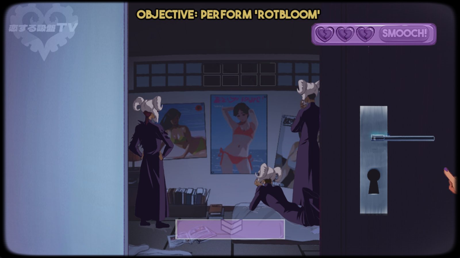 Now, how do you go about romancing Rhok’zan? Well, first you have to survive. Most of the game takes place in your Japanese-style childhood home, which has been taken over by the Thousand. You move around in a first person view, moving the cursor to the edge of the screen to pan around your current location in an incredibly impressive 360 degrees. The 2D image wraps around perfectly, it’s something you might not even notice at first. You can interact with anything by clicking on it, and move through doors by clicking on them, then sliding the door open with your mouse.