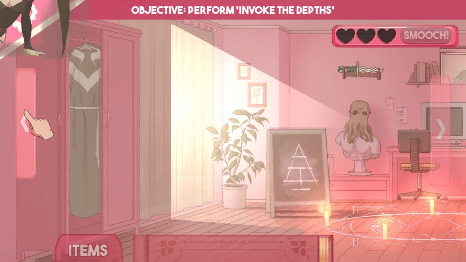 Visual novels are arguably infamous for not having any “gameplay”, but Sucker for Love actually implements point and click puzzles for each date. Your apartment has several objects you can interact with, like clothing you can put on, candles you can light, and a poster you can remove. By scrolling to the right, you can also access the bathroom, along with the mirror, sink, and shower, and the door just outside your top floor apartment. At the bottom of the screen is the book corresponding to the cutie you’re currently trying to woo. Contained within are several rituals you must perform using items in your home to progress the date, such as converting the leftovers in your fridge to something more palatable by lighting some candles and chanting a phrase. Reading a phrase requires you to click and hold on the first letter, then slowly move your mouse across the sentence. It’s a neat way to convey how difficult it is to speak this non-human language, but can be a bit frustrating or finicky sometimes – I died a lot in the second and third chapters because my movement was slightly too quick for less than a second.