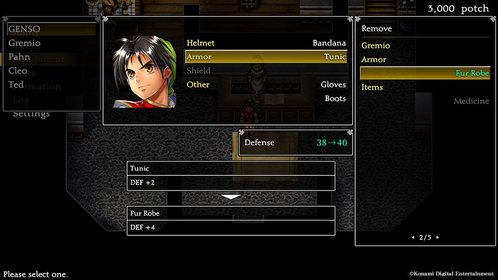 I do wish one element made its way backwards from the second title to the first – Optimization. In Suikoden II, you can buy equipment, throw it on right then, trade in your gear for potch while still in the vendor window, or throw it back into your bag, and even click “Optimize” to allow the game to equip what it believes is the best equipment in your possession. It’s handy for keeping you moving instead of digging around in menus, so I was sad to see that it hadn’t made its way backwards to the first title.