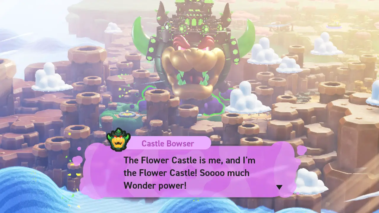 While every other aspect of the Mario experience feels noticeably pushed forward, the boss fights stand in stark contrast. They lack creativity, and there are barely any in the game. I highly doubt that all of Nintendo’s greatest minds got together and the best that they could come up with were variations on that Super Mario Bros. 3 turtle that waddles back and forth and rolls around in his shell when you jump on him. Yet somehow, that’s pretty much what Wonder delivers. These boss fights have such little presence in the game that some worlds will skip them and instead provide some paper-thin narrative excuse for why you can progress the game anyway.