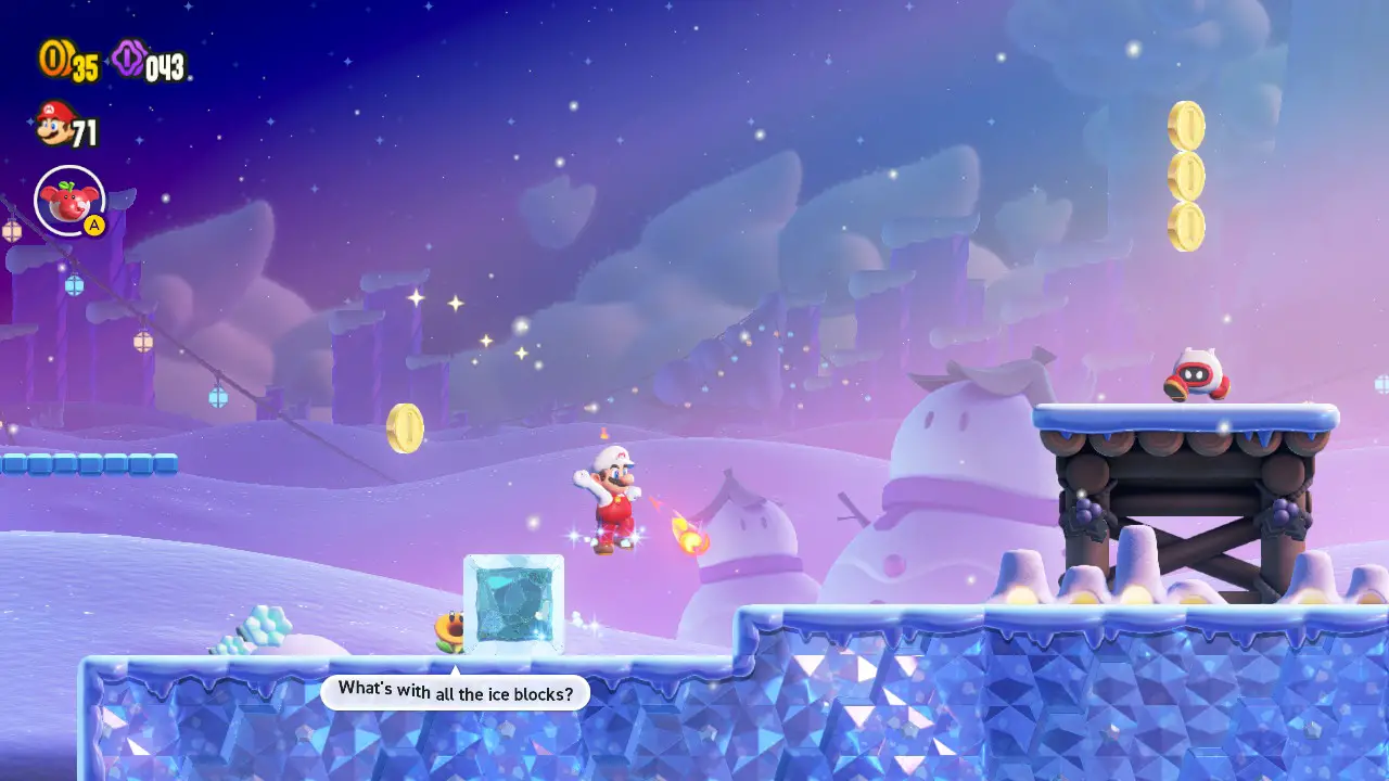 Well, that and some uninvited guests keep drawing attention to it. Wonder features strange talking flowers littered throughout every stage of the game. They make comments, give hints, and tell jokes. On the surface, you may excuse their presence as some wacky oddity in a game all about such things.