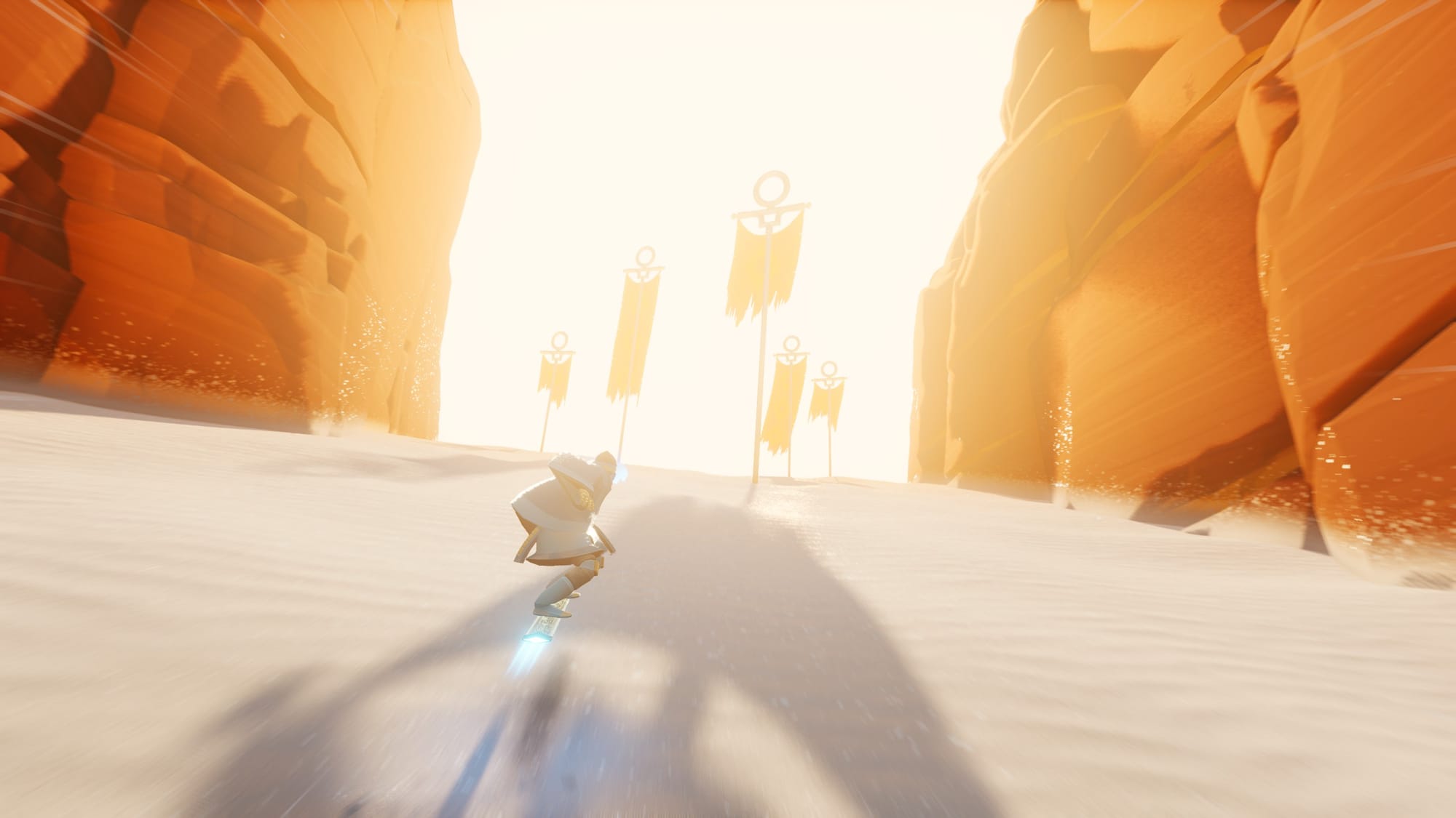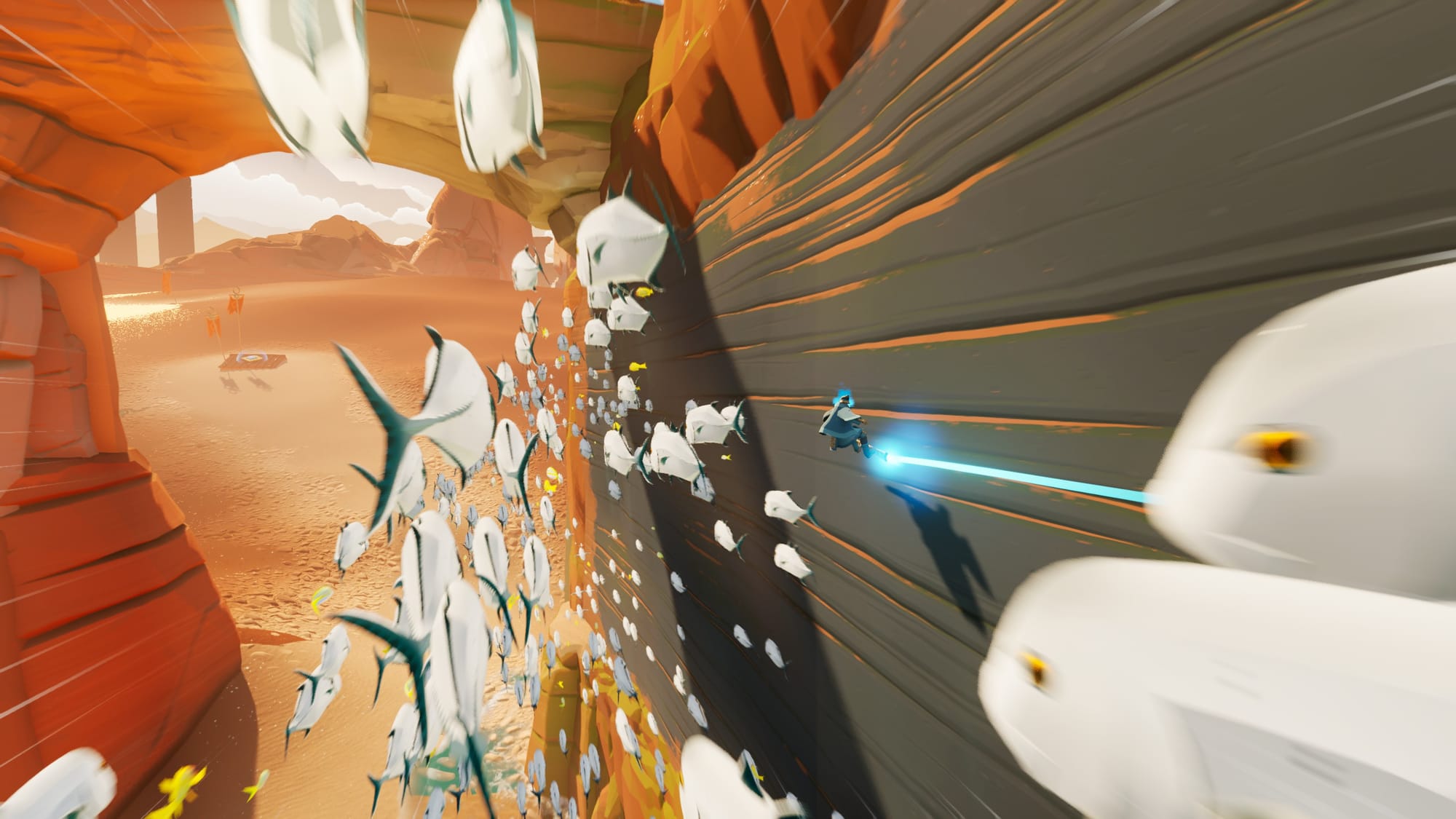 There’s one thing I would like to call your attention to. While PlayStation went out of its way early on to showcase the DualSense controller with games like Astro’s Playroom and Returnal, not much has been done to highlight the controller’s haptic feedback. Sword of the Sea is a notable addition to that list. Whether you’re surfing over sand, gliding across the water’s surface, or sliding across ice, every bump and glide can be felt with fidelity that borders between jarring and immersive. I say jarring only because it’s so immersive; it took my brain a few moments to adjust to it. If you’re playing on PC and have access, I’d strongly encourage you to plug up a DualSense controller for the best experience.
