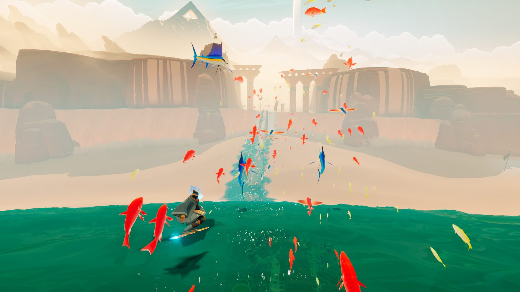 In Sword of the Sea, you’ll take on the role of the Wraith, a warrior resurrected in the Necropolis who takes up the Hoversword on their quest to turn arid deserts and frozen wastelands into vibrant oceanic landscapes teeming with life. As you explore each environment, you’ll activate points that beckon the ocean beneath the land to spill forth, transforming the world into a beautiful, colorful world full of fish, turtles, and more.