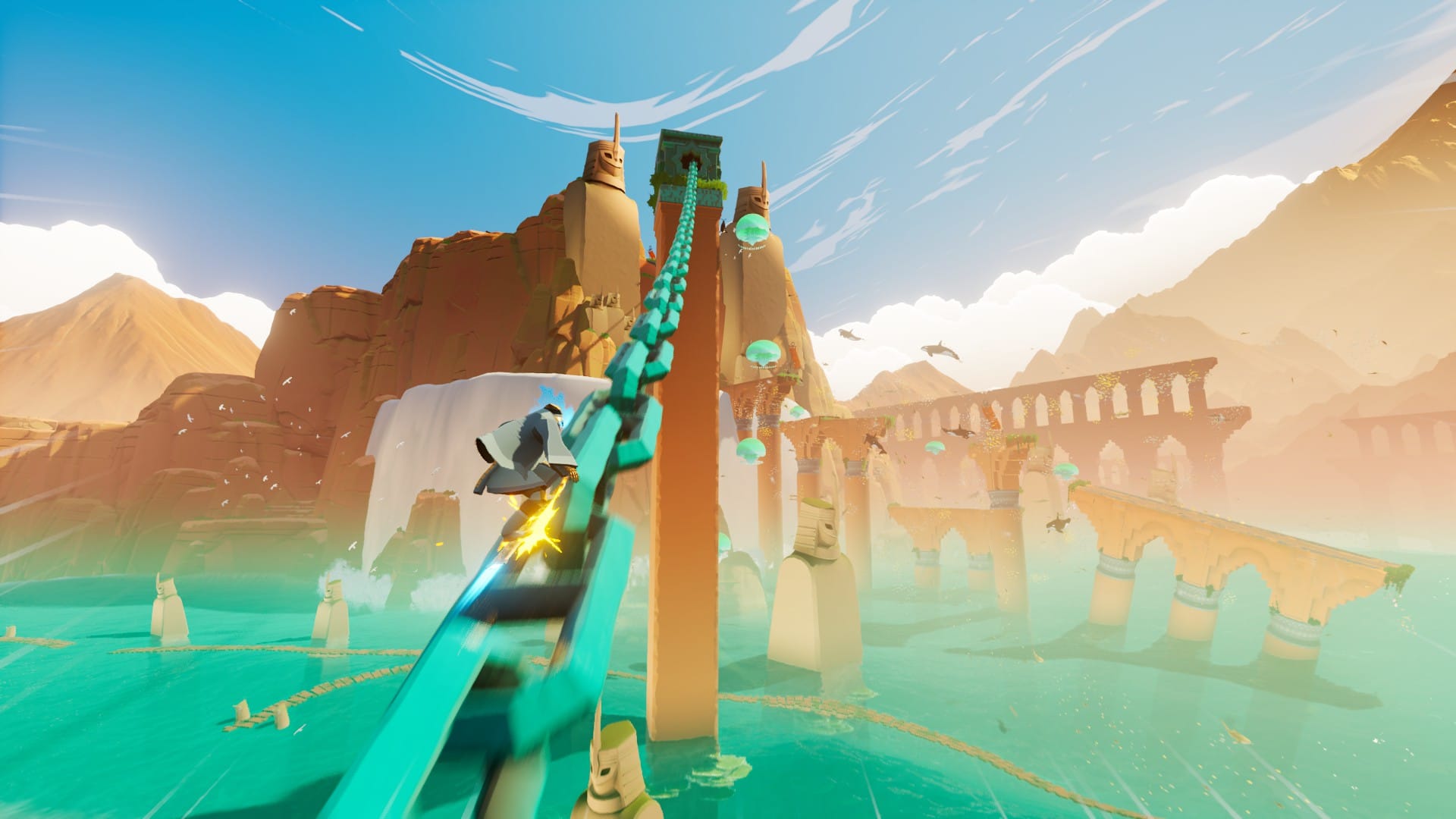 I love Sword of the Sea’s aesthetic vibe. The soundtrack is low-impact and immersive, letting you enjoy the on-screen experience without distraction. The game’s art design is also just incredible. While it isn’t pushing out crazy geometric numbers like some of today’s top technical powerhouses, Sword of the Sea has jaw-dropping visuals. Animation is smooth and fluid, and environments are bright and eye-catching. There’s nothing quite like watching the Wraith activate a node and experiencing the sea burst forth with various wildlife swirling about. It all integrates so seamlessly into the experience, it offers something few games have delivered. It’s exhilarating. I audibly hooped as playful dolphins joined me on my rounds for a few delightful seconds. It’s gorgeous and joyful in a special way.
