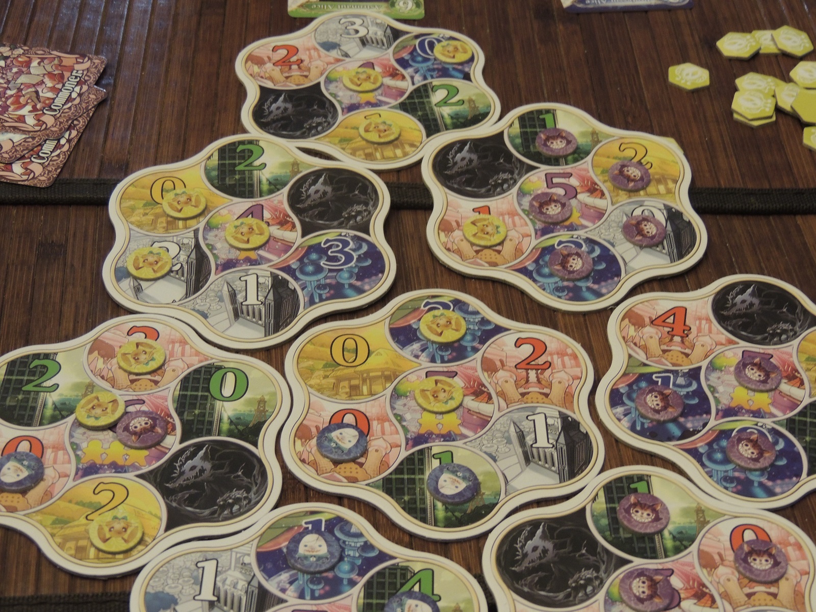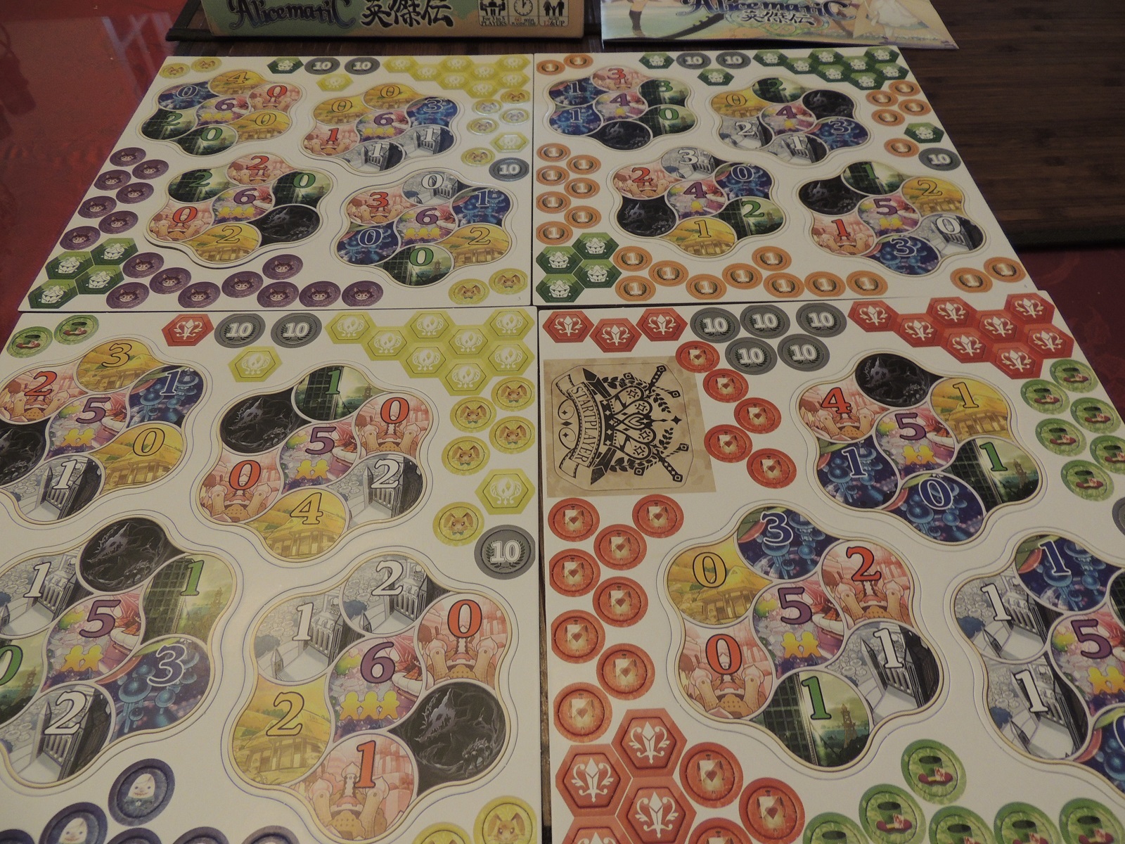 After each player takes 14 turns, the game ends and points are scored. Each tile awards six points to the player who has the most spaces claimed, with the second place player getting three. (In the case of a tie for most spaces claimed, each tied player gets three points, but a tie for second place awards nothing). Each colored slot also awards points to the player or players who have the most face-up Alices, corresponding to the number played (so if someone has three face-up Alice cards in the green slot, they would get three points). Finally, any postgame Megalomania effects are in play (usually through white Alice cards which grant perks like gaining two victory points for every three of a certain colored territory obtained). The player who has the most victory points at the end wins, though there are more win conditions should two or more players be tied.