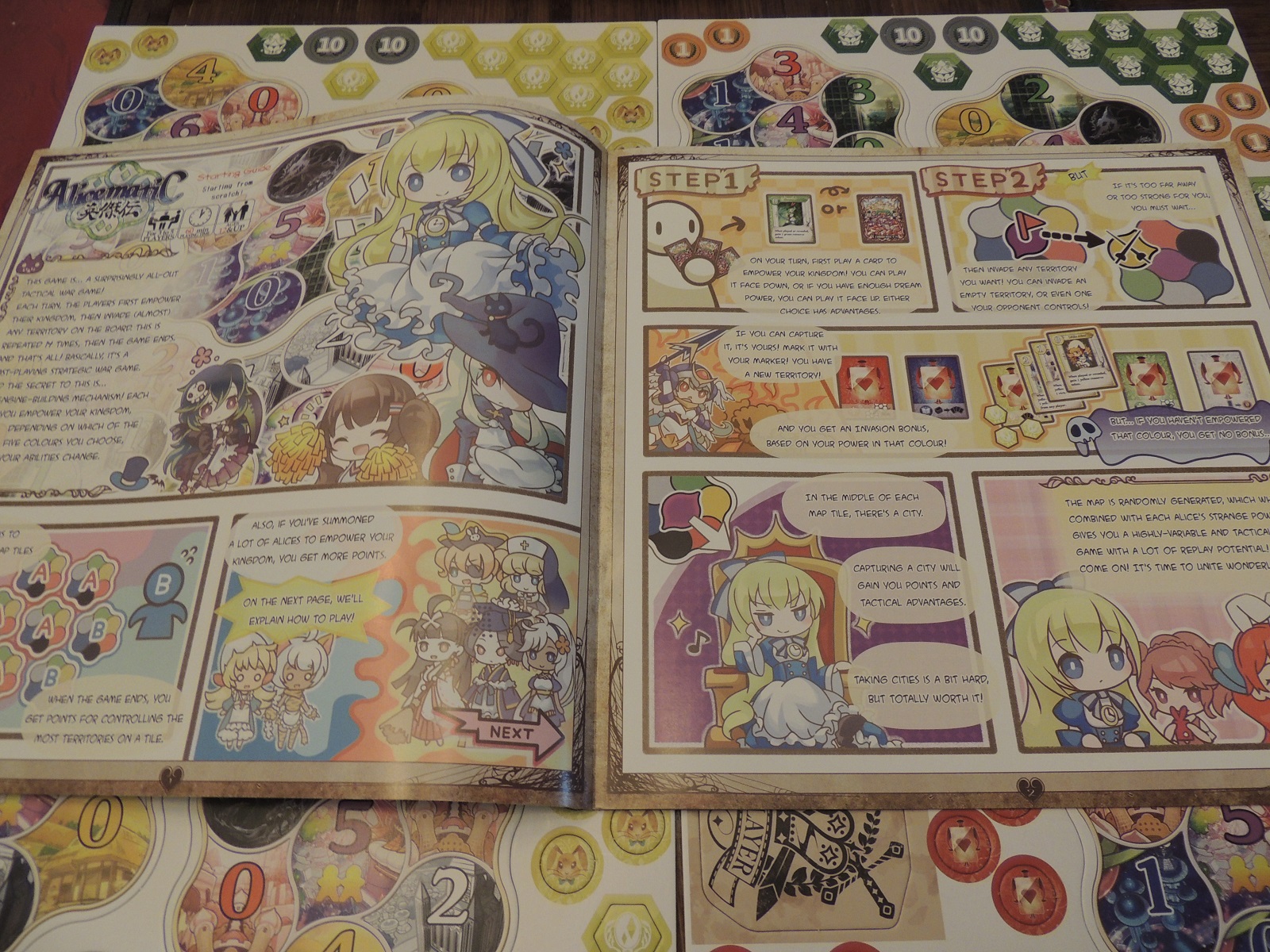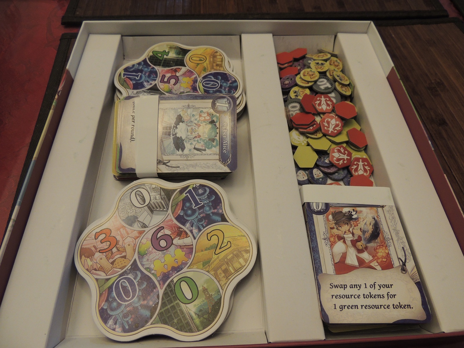 What I really love about the game, however, is the art style and components. While the boxart dons a lovely anime aesthetic, the Alice cards themselves are chibi avatars, which gives a little moe atmosphere to the whole experience. The art style is tastefully done, delving into cute rather than sensual, and I enjoyed the card art. The construction of map tiles is sturdy, with tokens also being solid and durable. Combined with a box that feels pretty darn perfectly sized, I can imagine lugging this around once I can get more people to understand the rules. The game doesn’t include small bags to carry tokens and other cards, however, so you might want to invest in a few small Ziploc baggies beforehand.