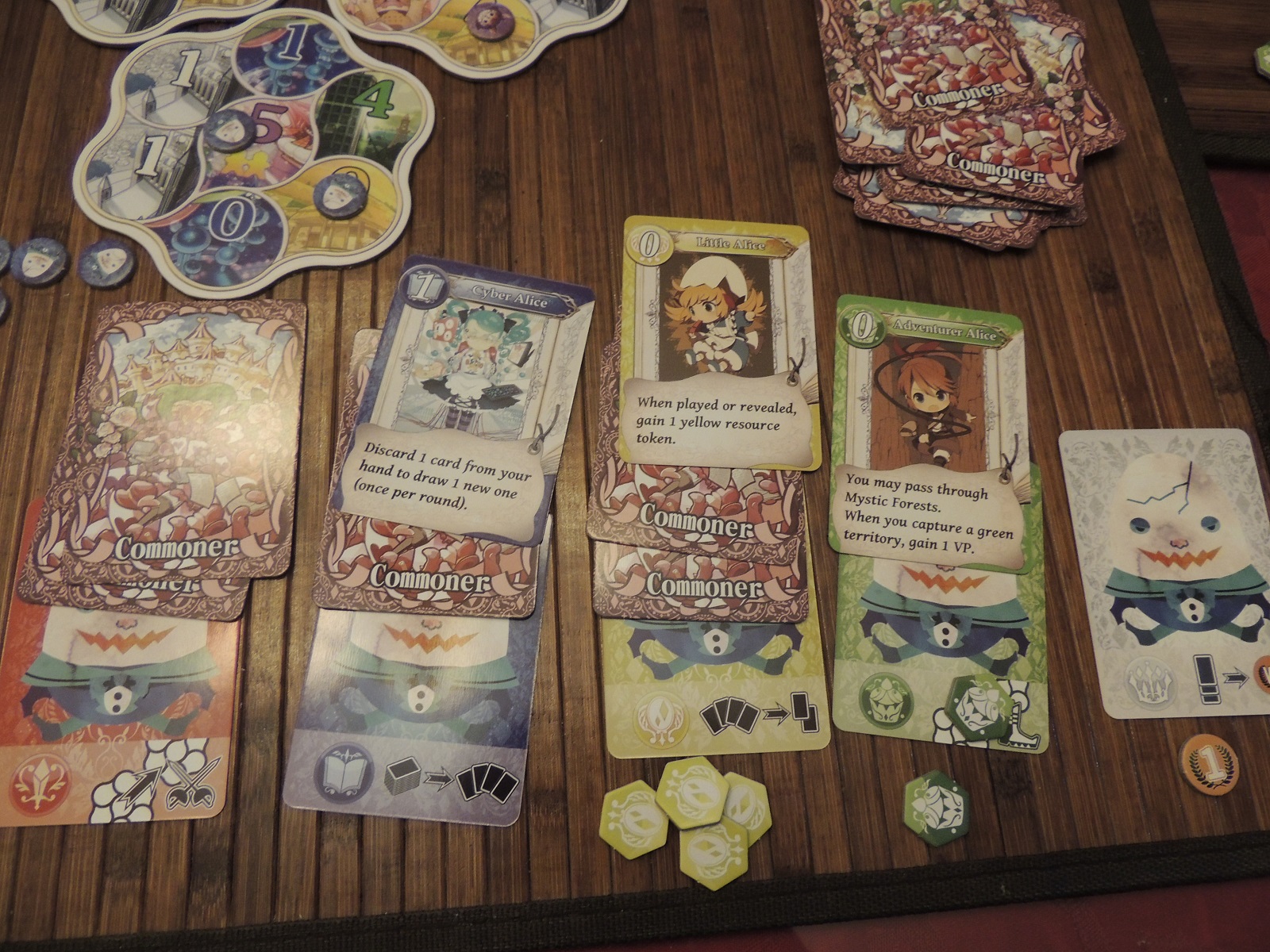 Summoning an Alice is simple: If you have enough dream power (yellow), you may summon her and activate her Megalomania ability. They’re all pretty useful, from letting you swap resource tokens to gaining victory points at the end of the game. Each face-up Alice is placed on her corresponding color, thus increasing that power stat by one. However, if you don’t have enough power or want to just increase power stats, you can play the Alice face-down as a commoner; while her Megalomania ability won’t be triggered, this is a great way to beef up your stats (and allows you to draw another card; summoning an Alice face-up won’t let you do this). However, you can only have four cards in any given color (though Emperor Alice will increase this by one), which means placing too many commoners on one color can prevent you from playing a stronger Alice later in the game.