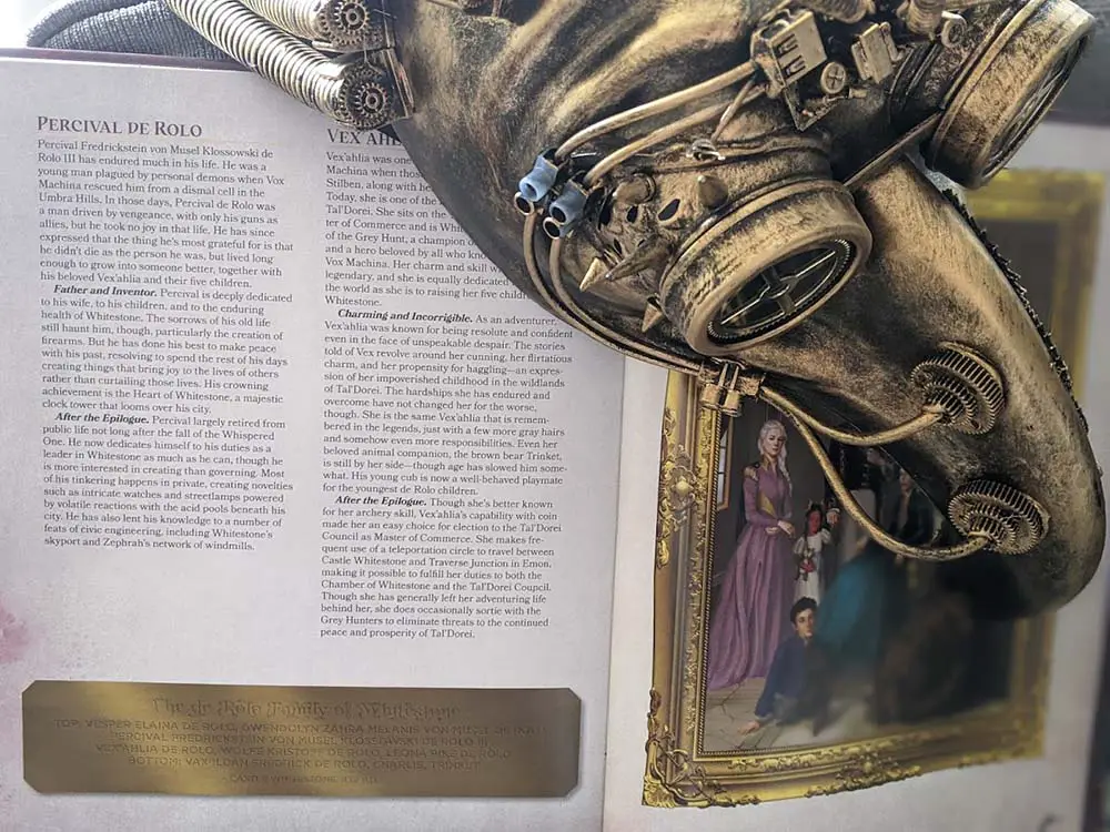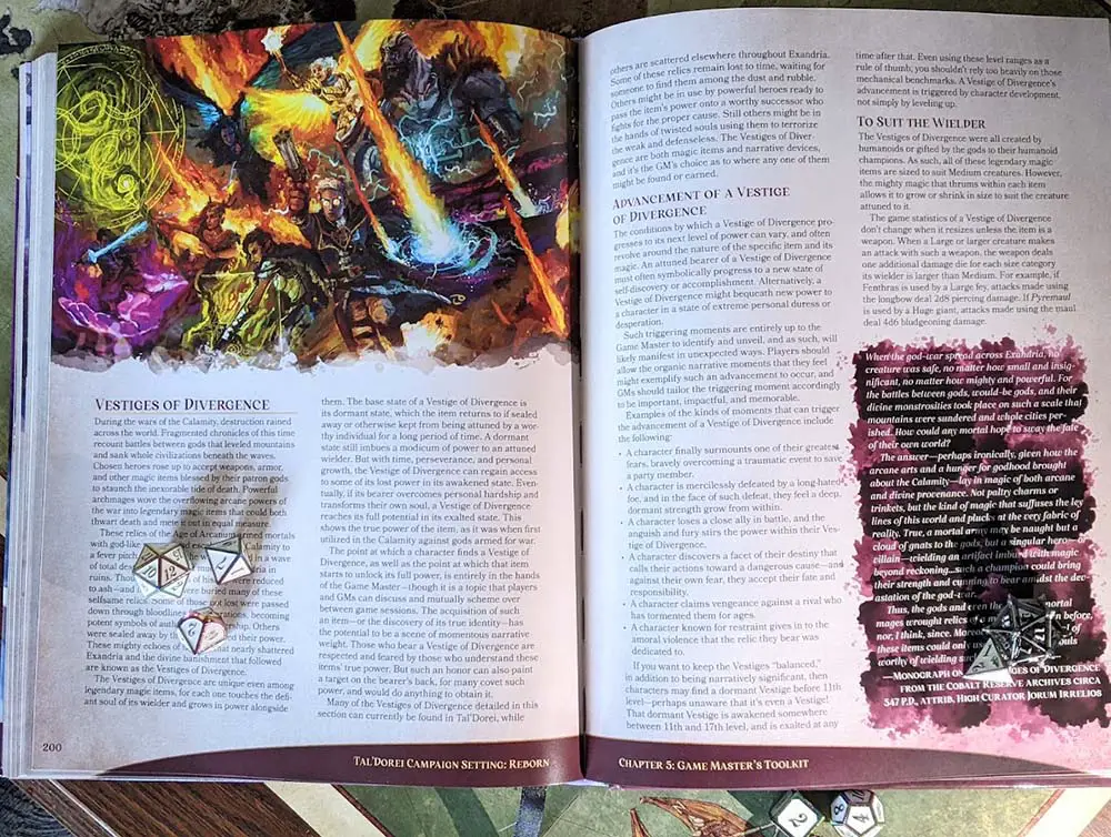 The Game Master’s Toolkit contains a good bit of DM’ing advice around creating good conflict, how to reward characters, and crafting an all-around memorable campaign before diving into perks and challenges specific to Exandria. Here you’ll find various magical items and treasures found in Tal’Dorei, and two pages dedicated to items and tools created by the Ashari. That’s when we come to the really good stuff, the stuff every Vox Machina fan wants: a full ten pages detailing the Vestiges of Divergence, their histories, and their benefits in their Dormant, Awakened, and Exalted forms.