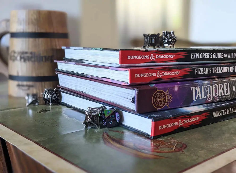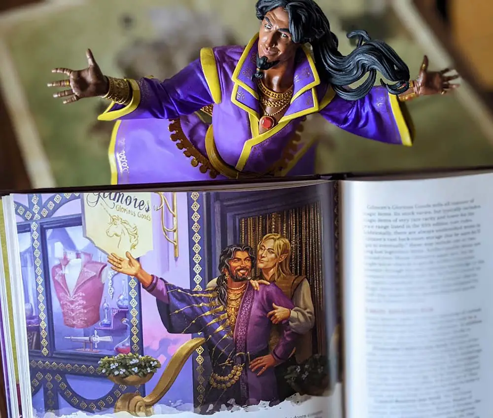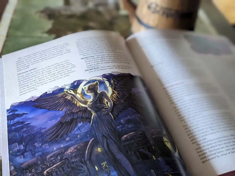 First off, the book itself. While Tal’Dorei Campaign Setting Reborn has 280 pages, the pages themselves are of a higher quality and weight than most other D&D books–meaning that it is thicker than the Monster Manual, which contains 350 pages. Tal’Dorei Reborn is just shy of 1” thick, while the Monster Manual measures just over 0.75”. At just under 9” deep, this book is also thicker than most D&D books, which come in at an even 8”.