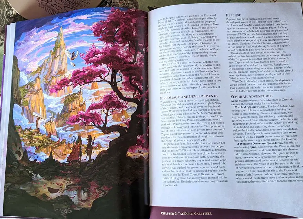 What you will find in this book is a whole lot of history, myth, politicking, factions, and the kind of lore that has actually been pretty light in most 5e books. While lore this dense could be seen as oppressive or overwhelming for newcomers in another setting, most fans of Critical Role already have a basic understanding and vocabulary around the peoples and powers of this world – the Calamity, the Betrayer Gods, the Tal’Dorei Council, the Ashari, etc, which means that many players are likely be excited to learn more about how all of these stories and entities fit together. It’s an incredible resource for anyone looking to run a more political game, where the really important battles are won via knowledge of history, religion and alliances. It even features the Exandrian calendar: 11 months, the number of days in each month, major holidays and when they are celebrated, and a brief guide on how to use said calendar, if you wish to do so.