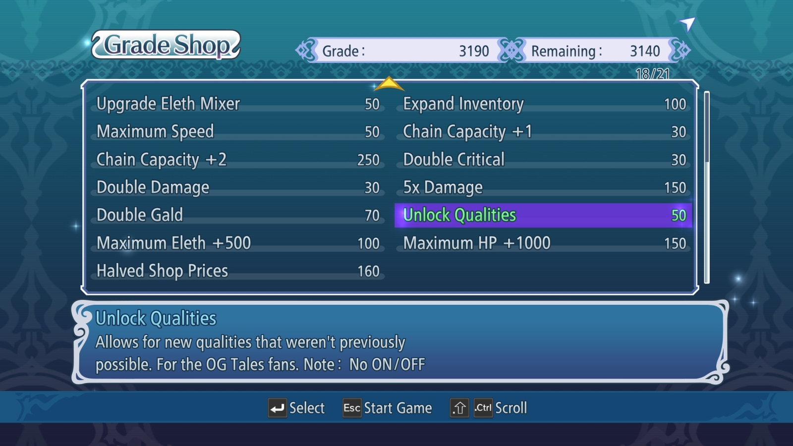 The biggest change for the remaster is the Grade Shop. Grade has been another defining trait of the Tales Of series, accumulated throughout the games and used for New Game+. You spend the Grade you earned on bonuses like an expanded inventory limit, automatically unlocking skills, costumes, speeding up experience gains, and way more. For the remaster they give you the Grade Shop at the start and while there are certainly a lot of great options, I really recommend sticking to the vanilla experience, but there are tons of options and if you feel like using the extra help, or if you’re a returning player you can immediately skip the childhood section.